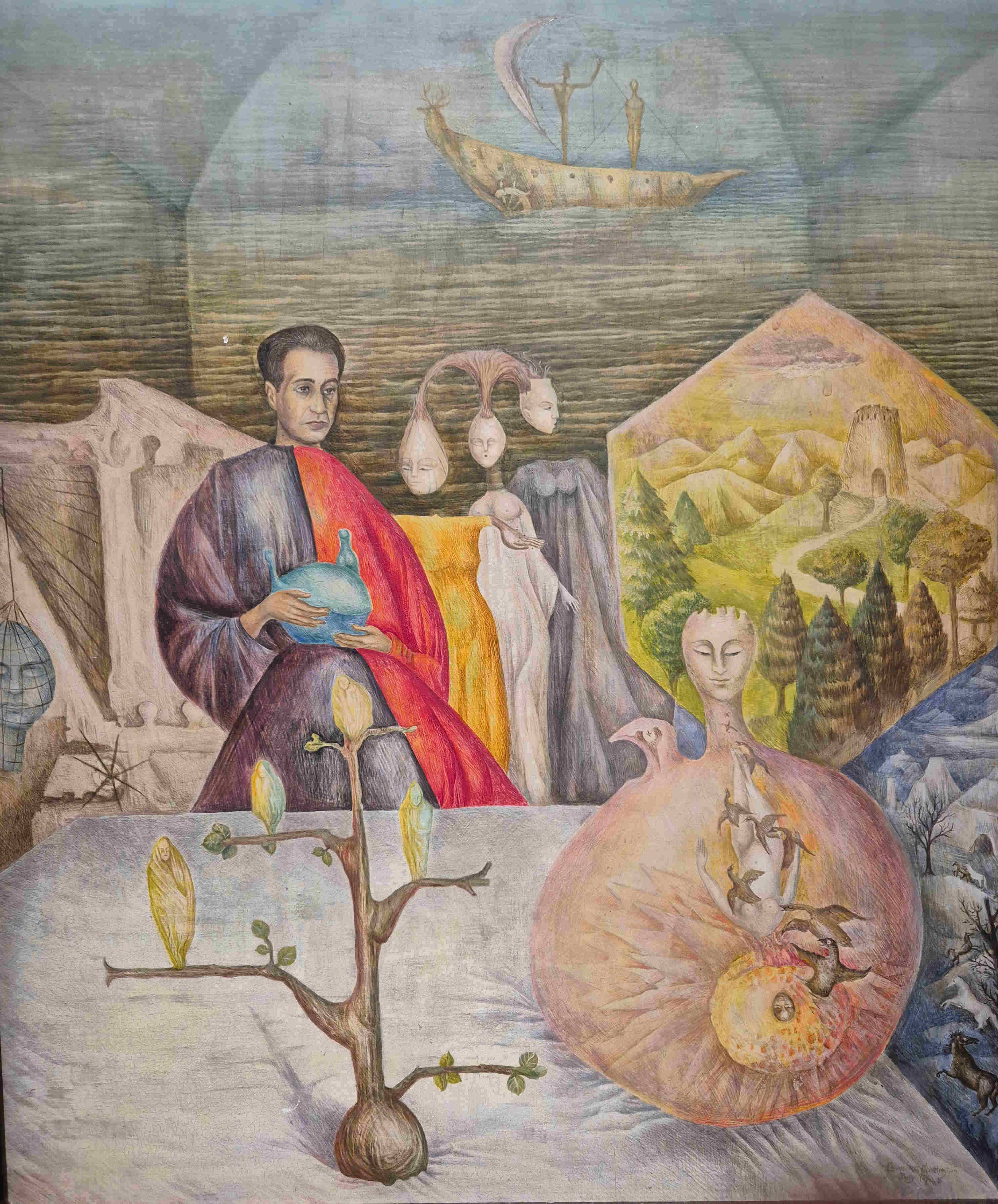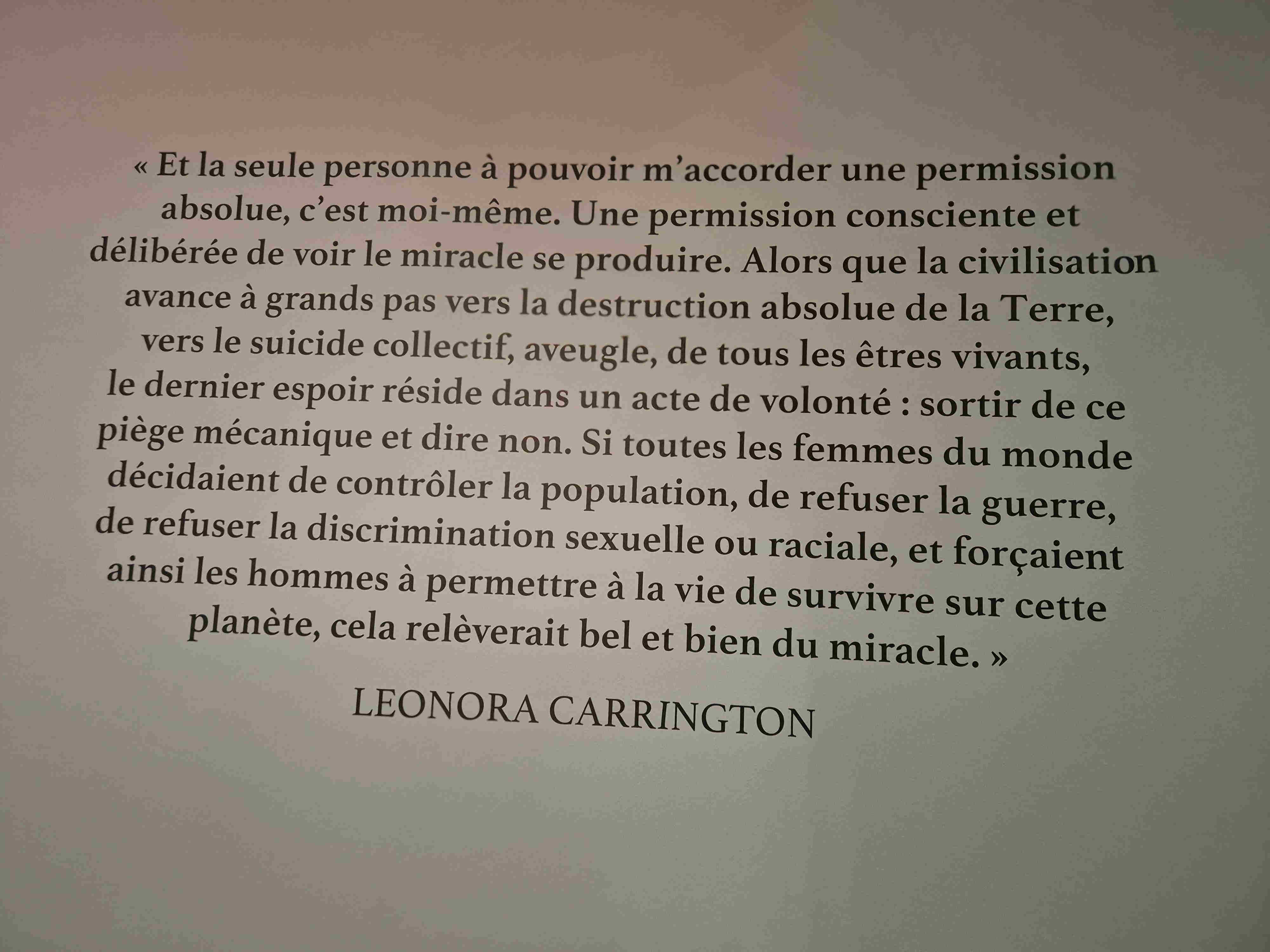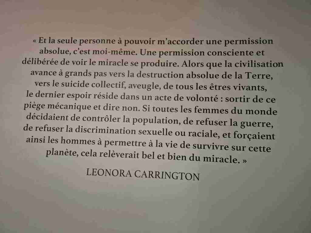 Troisième exposition, c’est au Luxembourg, c’est sous un éclairage sombre, l’éclat des couleurs brillantes de la grande prêtresse du surréalisme, Leonora Carrington. Quel personnage ! Née dans une riche famille britannique, aimant par-dessus tout le dessin, en accomplissant des milliers durant son enfance, tous avec autant d’originalité, d’imagination et de fantaisie, des fées, des animaux fantastiques… passant à la peinture avec une facture rappelant la Renaissance sur des toiles parfois format prédelle où l’on voit se battre ours et chat, usant de la tempera pour mieux se rapprocher des primitifs, rencontrant enfin les surréalistes qui la saluent bien bas mais ne la considèrent pas moins que comme une femme, avec tout ce que cela signifie en ces années où l’homme domine encore tellement. En ce temps-là, les femmes sont reconnues quand elles jouent le rôle de muse. Cela n’intéresse pas du tout notre Leonora (« je n’ai pas le temps de jouer à la muse, dira-t-elle, j’ai trop à faire pour apprendre à peindre). Cela ne l’empêche pas de se lier avec Max Ernst. Ils iront tous les deux s’établir à Saint-Martin d’Ardèche dans une maison dont on dit qu’elle garde encore peut-être les décorations faites par les deux artistes sur quelques portes d’armoire. Mais la guerre est là, le pauvre Ernst est encabanné parce qu’allemand (au camp des Milles), cas de force majeure, ils se séparent, elle suit sa propre route, se réfugie en Espagne où elle se fait violer par des soldats franquistes, où elle plonge dans la folie, est internée et connaît là les heures les plus sombres de sa vie, qui transparaîtront sur plusieurs de ses tableaux. Enfin elle s’échappe et c’est le Mexique, un autre homme, deux enfants, une gloire établie confirmée par des commandes, jusqu’à ce qu’elle quitte le Mexique à la suite de la fusillade de 1968 sur le campus. Elle y reviendra pourtant quelques années plus tard et y terminera sa vie à l’âge de 94 ans. On voit un petit film sur elle vers ces âges-là, elle est désormais apaisée, elle pense que l’amour c’est une ivresse et que toute ivresse laisse un mal de tête, pour elle désormais, son amour va à ses enfants avant tout. L’une de ses toiles les plus envoûtantes est une tentation de Saint-Antoine où, aux antipodes de l’histoire racontée, le saint paraît étrangement serein, non troublé, tête répétée trois fois au centre d’une corolle blanche. Les tableaux de Léonora sont des rêves. Chacun essaie à son réveil de fixer par des mots les rêves dont il se souvient, rares sont ceux ou celles qui savent leur donner une apparence graphique ou picturale.
