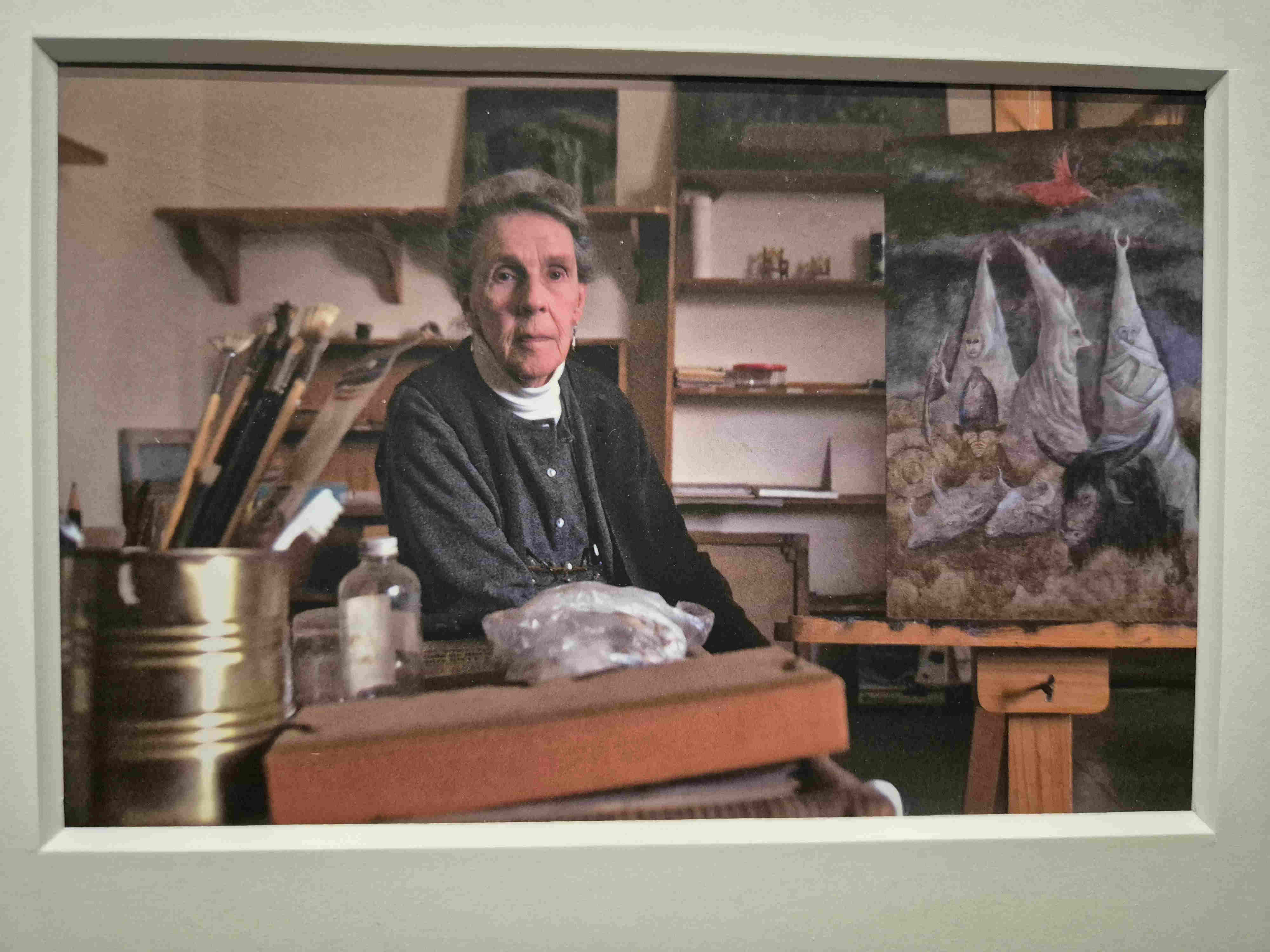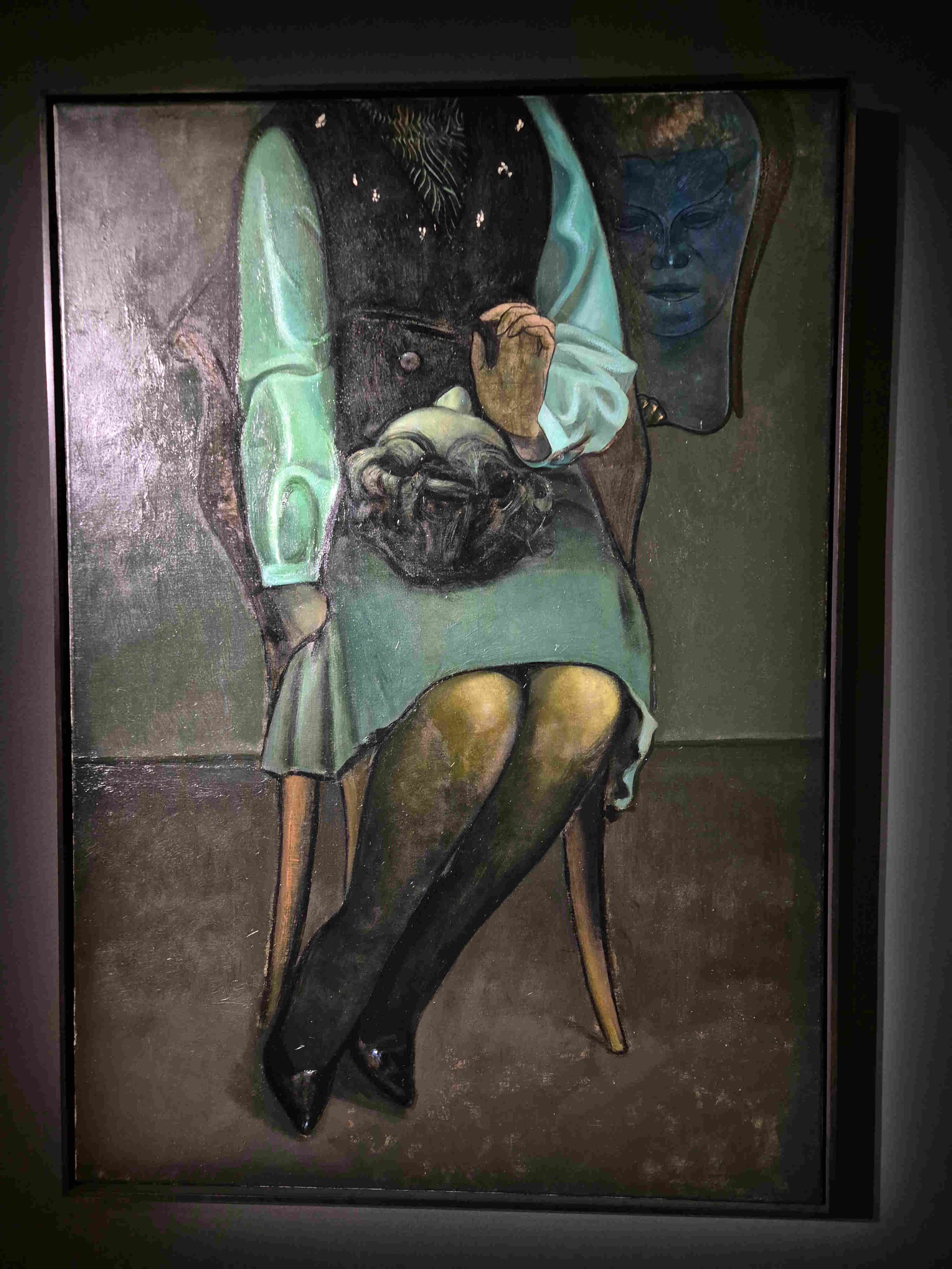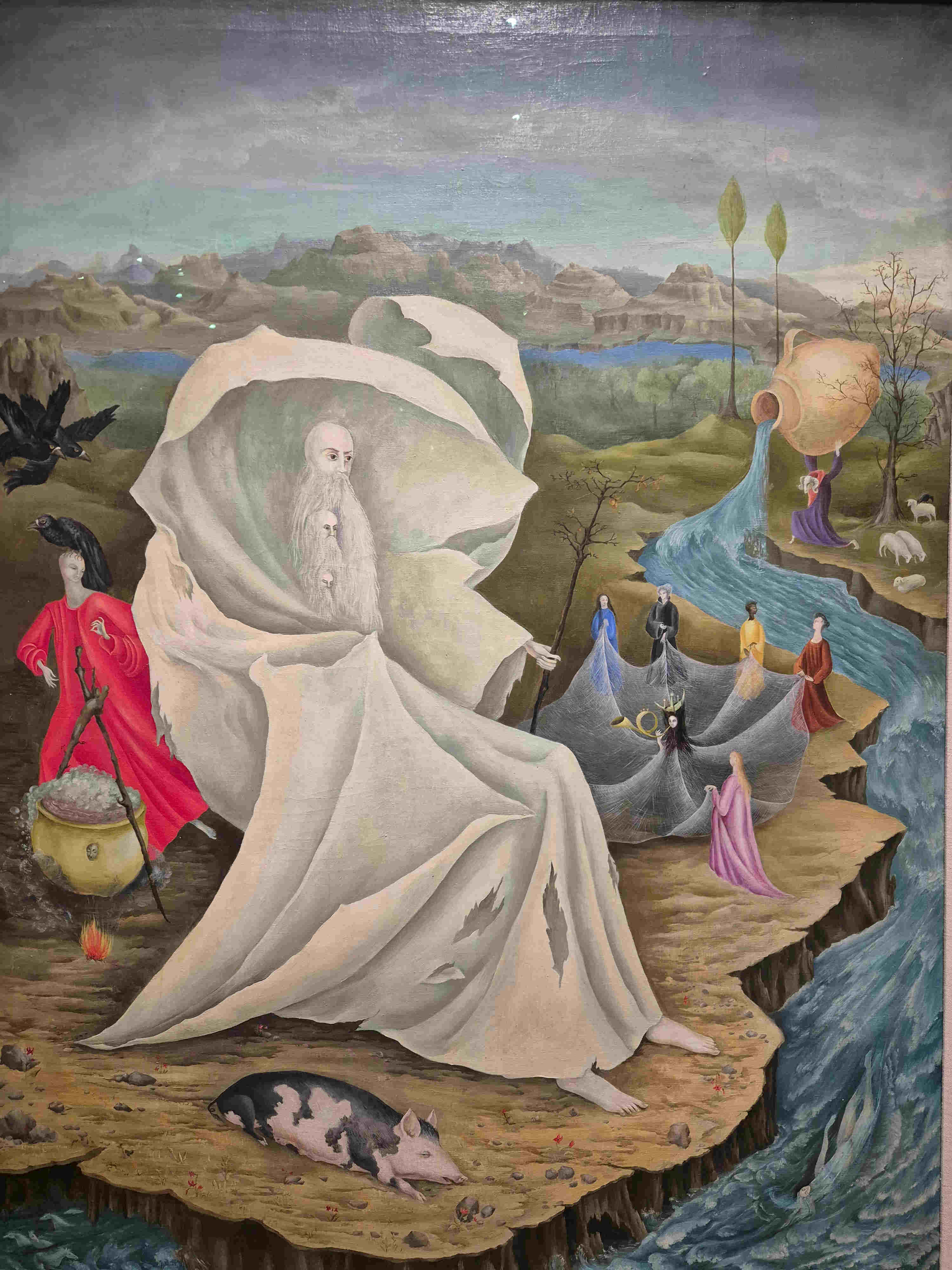 Troisième exposition, c’est au Luxembourg, c’est sous un éclairage sombre, l’éclat des couleurs brillantes de la grande prêtresse du surréalisme, Leonora Carrington. Quel personnage ! Née dans une riche famille britannique, aimant par-dessus tout le dessin, en accomplissant des milliers durant son enfance, tous avec autant d’originalité, d’imagination et de fantaisie, des fées, des animaux fantastiques… passant à la peinture avec une facture rappelant la Renaissance sur des toiles parfois format prédelle où l’on voit se battre ours et chat, usant de la tempera pour mieux se rapprocher des primitifs, rencontrant enfin les surréalistes qui la saluent bien bas mais ne la considèrent pas moins que comme une femme, avec tout ce que cela signifie en ces années où l’homme domine encore tellement. En ce temps-là, les femmes sont reconnues quand elles jouent le rôle de muse. Cela n’intéresse pas du tout notre Leonora (« je n’ai pas le temps de jouer à la muse, dira-t-elle, j’ai trop à faire pour apprendre à peindre). Cela ne l’empêche pas de se lier avec Max Ernst. Ils iront tous les deux s’établir à Saint-Martin d’Ardèche dans une maison dont on dit qu’elle garde encore peut-être les décorations faites par les deux artistes sur quelques portes d’armoire. Mais la guerre est là, le pauvre Ernst est encabanné parce qu’allemand (au camp des Milles), cas de force majeure, ils se séparent, elle suit sa propre route, se réfugie en Espagne où elle se fait violer par des soldats franquistes, où elle plonge dans la folie, est internée et connaît là les heures les plus sombres de sa vie, qui transparaîtront sur plusieurs de ses tableaux. Enfin elle s’échappe et c’est le Mexique, un autre homme, deux enfants, une gloire établie confirmée par des commandes, jusqu’à ce qu’elle quitte le Mexique à la suite de la fusillade de 1968 sur le campus. Elle y reviendra pourtant quelques années plus tard et y terminera sa vie à l’âge de 94 ans. On voit un petit film sur elle vers ces âges-là, elle est désormais apaisée, elle pense que l’amour c’est une ivresse et que toute ivresse laisse un mal de tête, pour elle désormais, son amour va à ses enfants avant tout. L’une de ses toiles les plus envoûtantes est une tentation de Saint-Antoine où, aux antipodes de l’histoire racontée, le saint paraît étrangement serein, non troublé, tête répétée trois fois au centre d’une corolle blanche. Les tableaux de Léonora sont des rêves. Chacun essaie à son réveil de fixer par des mots les rêves dont il se souvient, rares sont ceux ou celles qui savent leur donner une apparence graphique ou picturale.