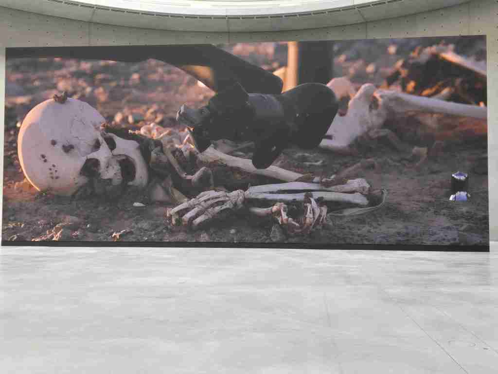 Se poursuit au rez-de-chaussée, sous la coupole, avec l’œuvre monumentale de Pierre Huyghe, nous sommes dans le désert d’Atacama, figuration de ce qui nous attend si la planète continue de se réchauffer, quand il ne restera plus que des robots savants manipulateurs qui soulèveront les os blanchis de nos squelettes depuis longtemps desséchés.
