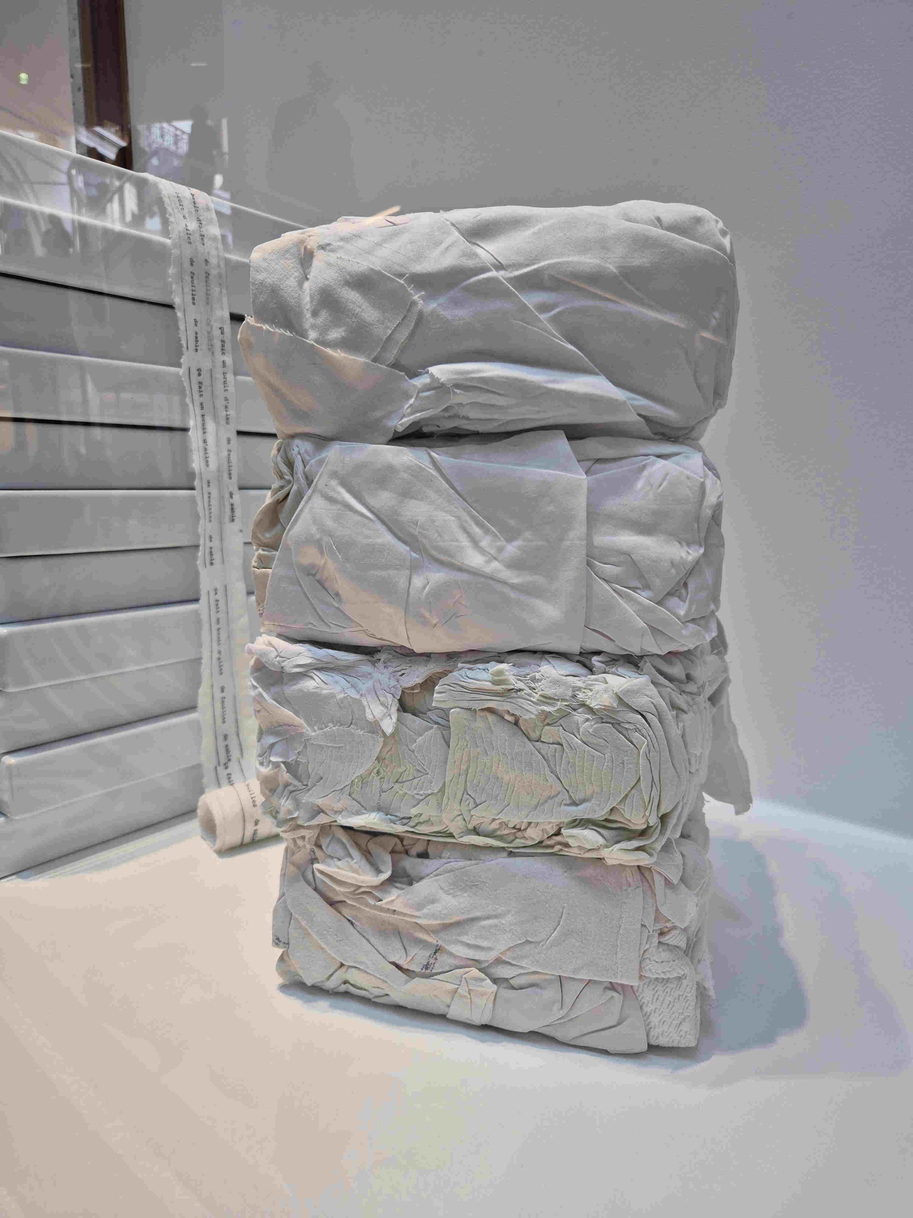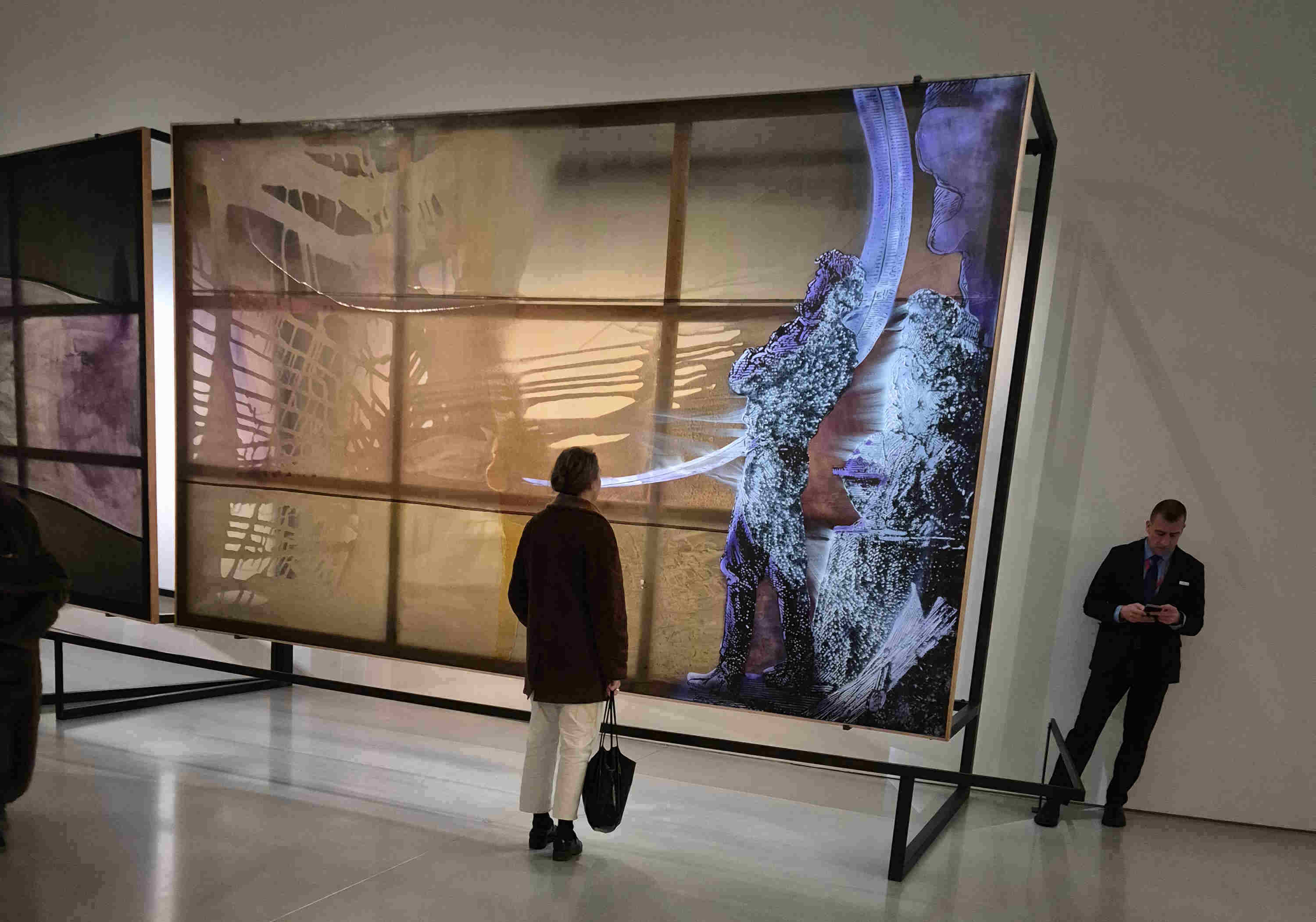 Non loin de là, surgissent les panneaux géants de Sigmar Polke méditant à partir de Karl Jaspers sur l’existence d’une période antique (entre 800 et 200 avant notre ère) qui a vu s’épanouir les Grands Sages et Penseurs Confucius, Zarathoustra, Bouddha, Homère ou Platon. Toiles transparentes, lumière mordorée et personnages dessinés comme en plein XVIIIème, anges regardant d’en haut, et jeunes hommes et femmes devisant sous le portail de l’Académie. Dans des vitrines, tout autour de la coupole, les œuvres de Laura Lamiel, « ça fait un bruit d’ailes, de feuilles, de sable », matériaux divers : tissus, briques émaillées, oiseaux ramassés, feuilles séchées, anciennes chaussures d’enfants, parfois dans une poussière rouge ou ocre, et parfois le blanc qui inonde la matière, variation de lumière et jeu sur l’opposition lumière / opacité.