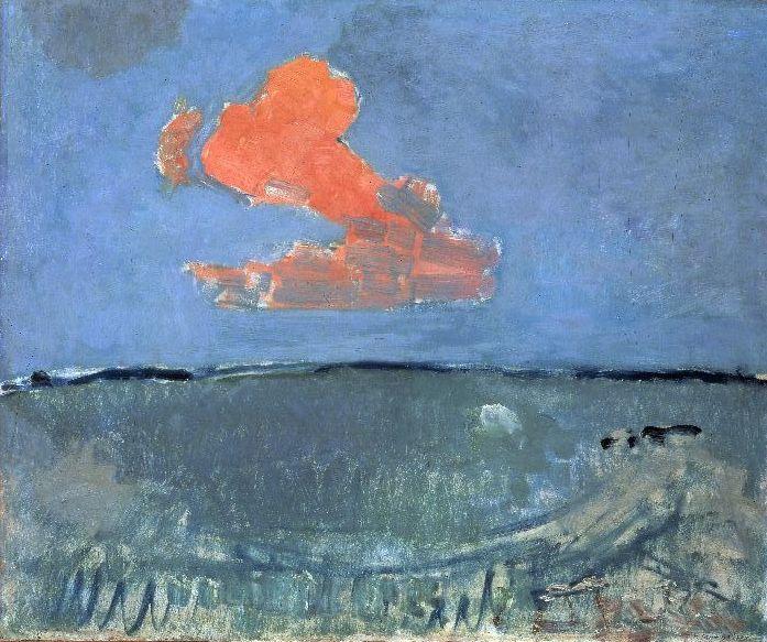 C’est la dernière semaine pour Mondrian. Un moment de libre et j’y suis allé ce lundi cherchant sans doute quelque consolation dans cette recherche solitaire que fut, durant toute sa vie, l’œuvre du peintre néerlandais. Comme beaucoup d’expositions, celle-ci manquait de place pour s’étaler, tous ces carrés, toutes ces lignes auraient mérité davantage d’espace mais ici, tout était ramassé, blotti : la reconstitution de l’atelier donnait l’impression d’une visite d’appartement modèle dans une foire d’automne. Et pourtant… Devant ces meubles géométriques, ces pavillons élégants où toutes les lignes concourent à l’harmonie, je ne pouvais m’empêcher de penser : « voilà une modernité que nous n’avons toujours pas atteinte ». Comme quoi, la beauté est de bien peu de poids dans les choix architecturaux. En dépit de cette sensation d’étouffement, on soulignera surtout l’intérêt de la première partie de l’exposition : quand tout cela se préparait. Quand ces peintres épris d’absolu tiraient leur inspiration du courant théosophique, Annie Besant, Krishnamurti … Cela donne des toiles étrangement austères et dans l’esprit du symbolisme, et où déjà apparaît l’obsession des lignes, comme dans ce clocher zélandais rose et vert ou ce chrysanthème pourrissant (« métamorphose »), ou bien encore, un peu plus drôle, cette série de vaches peinte par van Doesburg. « Le nuage rouge » nous sert le cœur (mais c’était involontaire au moment où on a conçu l’exposition) car il rappelle immédiatement un autre nuage, hélas. « Bois » de Jacoba van Heemberck (1912) s’harmonise avec le thème de l’arbre, abondamment travaillé par Mondrian.