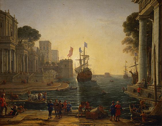 Mais le temps fort de l’expo, enfin ce vers quoi tous les trajets suggérés orientent, c’est bien sûr l’apport définitif à l’art du paysage de Nicolas Poussin et de Claude Lorrain. Jeux de lumière, travail sur la couleur, jeux avec le motif du tableau : on trouve tout cela dans la célèbre toile « Port avec Ulysse remettant Chryséis à son père ». Cela date de 1644. Ulysse et Chryséis… vous pouvez les chercher longtemps. Ils sont tout petits et perdus dans la foule sur le grand escalier de marbre qui conduit à l’entrée du monument, à gauche du tableau. Mais surtout, là, le truc, c’est d’avoir mis la nef juste dans l’axe du soleil, donnant effet de contre-jour. Nous ne sommes pas éblouis mais nous pouvons profiter de tout ce que l’éclairage solaire fait du clapotis des vagues et des vêtements des marchands sur le quai, au premier plan.