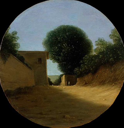 [Goffredo Wals, (1595 (?) – 1638 (?)), Route de campagne, avec une maison, vers 1619‑1620, Huile sur cuivre, D. 24,5 cm, Cambridge, The Fitzwilliam Museum]