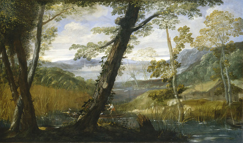 Parmi les artistes flamands, citons Paul Bril, spécialiste des ports et des grandes nefs commerciales, qui est venu à Rome, lui aussi, et a peint cet autre magnifique paysage qui, lui, se distingue par ses masses équilibrées, la plaine et les monts bleutés du lointain n’étant perceptibles que dans la mince échappée entre arbre touffu et rocher imposant, surmonté (comme c’est souvent le cas) d’une fortification. Bizarrement, Rubens est passé par là et y a ajouté sa patte, sous la forme du motif mythologique et des surprenants deux arcs en ciels jaillis du brouillard des gouttes de la cascade.