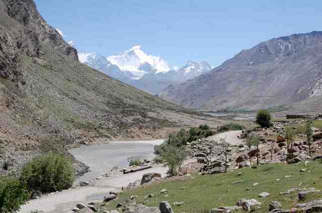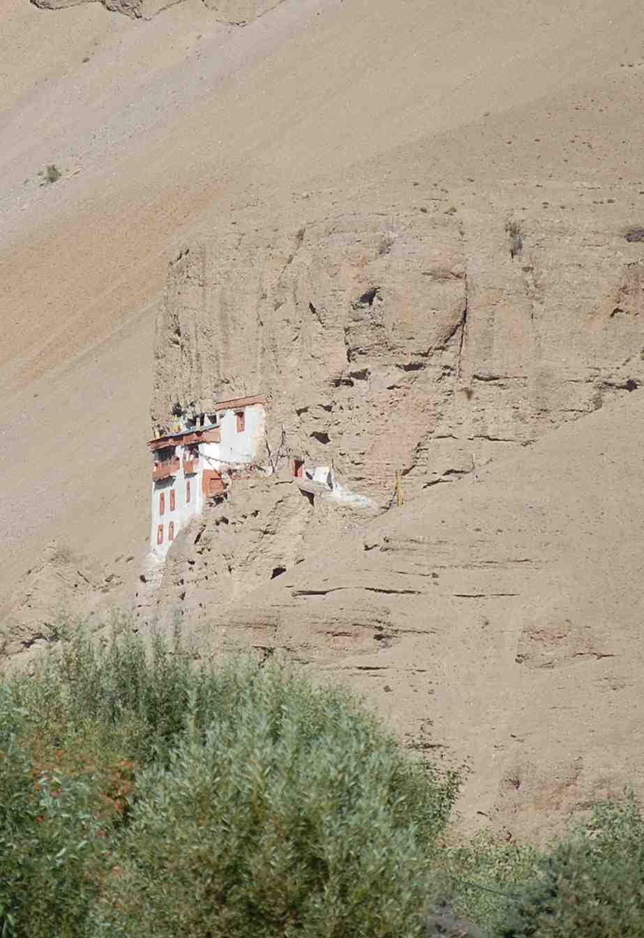 fascinant, agrippé au rocher comme un nid de guêpes et qu’on ne peut sans doute atteindre que par un rude sentier très raide. On le voit depuis notre campement, mais hélas manque le temps d’aller le visiter. Après, c’est le Bas-Ladakh, ou « Purig », capitale Kargil, habitée à plus de 80% par des musulmans chiites. Kargil laisse en principe une impression pénible à nombre de visiteurs à cause probablement de la rigueur des mœurs pratiquées, toute en contraste avec l’effervescence colorée des villages bouddhistes. Mais par ce temps superbe, la petite ville prendrait presque des allures de cité de villégiature estivale. Pourtant, l’agglomération a souffert : la bataille de Kargil, livrée par l’armée indienne contre le Pakistan en 1999, a en partie détruit les maisons, qu’il a fallu reconstruire, désormais sur un modèle uniforme, toutes de pierres grises. Cette région du Ladakh est boisée. C’est bien la seule. La ligne de cessez-le-feu passe sur la crête rocheuse qui domine la ville : c’est de là qu’en 1998, l’armée pakistanaise bombardait la gare routière. Mais si on oublie cela, on remarque surtout les sommets du Nun et du Kun qui, de loin, inscrivent la petite ville parmi les villes de haute montagne. Entre les arbres fruitiers, la route sinue jusqu’aux villages de la vallée de la Suru, direction Rangdum. Elle reste goudronnée encore un long moment. Au moins jusqu’à Pannikar.