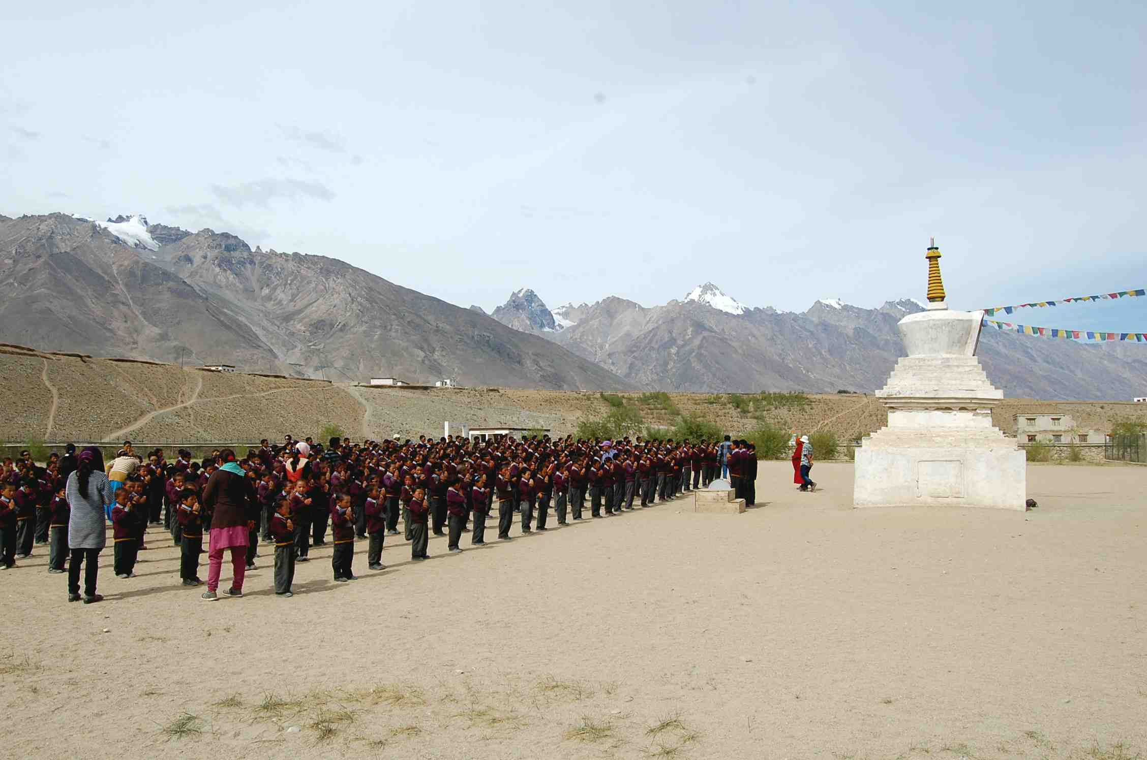 Sur la route de Pipiting, nous avons décidé de nous arrêter à la Lamdon school, dont nous savons qu’elle a été créée par un voyageur français dans les années 1990. Nous en avions déjà entendu parler lors de notre premier passage en 1998, sans avoir pu alors nous y rendre pour cause de tension à la frontière et de hâte à prendre l’ultime bus pouvant nous ramener sur Leh. L’école de Pipiting n’a cessé de se développer depuis 1988 et elle compte aujourd’hui une centaine de filles et près de deux cents garçons. Elle est gérée par l’association AAZ (« Aide Au Zanskar »).