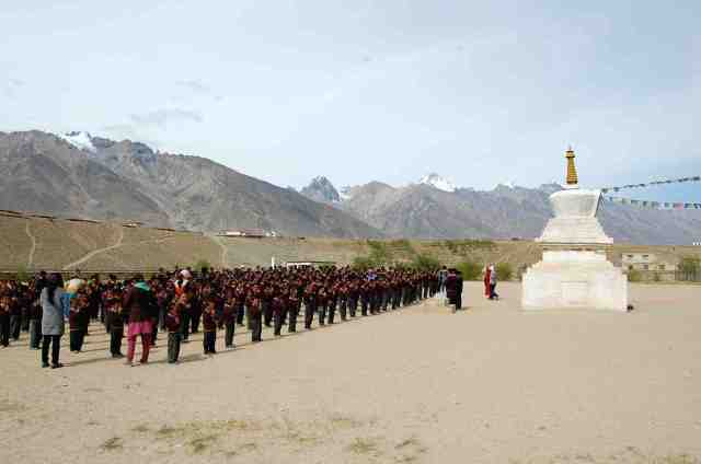 Nous n’avons pas besoin de notre guide pour y aller : il nous suffit de suivre les enfants qui se rendent en classe, tous en uniforme grenat. Nous sommes reçus par le principal, M. Sonam Dorjee, qui a bien voulu s’extraire un moment de sa classe juste pour nous renseigner (mais, dit-il, ce n’est pas trop grave car c’était un cours de complément). M. Sonam est tibétain, amené en Inde quand il était enfant, par ses propres parents qui s’en sont retournés presqu’aussitôt. Il a pu les revoir en passant clandestinement au Tibet une ou deux fois, mais actuellement, les visages de ses parents s’effacent de sa mémoire. Il a épousé une femme ladakhie. Nous la rencontrerons plus tard, grande et belle femme en robe bleue et lunettes de soleil, elle enseigne provisoirement les mathématiques. Les problèmes de cette école sont surtout dus à son isolement : il faut que les professeurs rejoignent leurs quartiers avant la fin mars, or en cette saison, le Zanskar est encore bloqué par la neige. Il n’y a que deux manières de l’atteindre : soit par le Chaddar (le fameux « fleuve gelé », immortalisé par Olivier Föllmi), soit par hélicoptère, ce qui demeure un moyen hasardeux, suspendu aux conditions météo et surtout aux disponibilités de l’armée. L’école a actuellement vingt-deux professeurs, mais est en manque de… professeur de mathématiques (avis aux amateurs !). La politique de recrutement est la suivante : toute famille des villages environnants a droit à la scolarisation gratuite d’un enfant. Le choix doit donc s’avérer cornélien au sein des chaumières… Les enfants apprennent quatre langues (le hindi, en tant que langue nationale indienne, l’anglais, le bhodi – langue locale  apparentée au tibétain – et l’ourdou, langue de l’état de Jammu et Cachemire(*)). Et ils peuvent aller jusqu’au niveau 10 (ce qui, en Inde, correspond à deux ans avant le bac, le bac étant niveau 12). M. Sonam espère que les enseignements pourront s’étendre jusqu’au niveau 12 d’ici quelques temps.