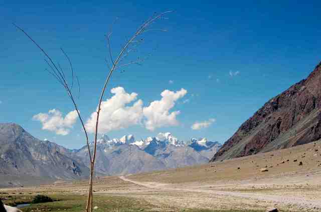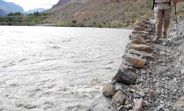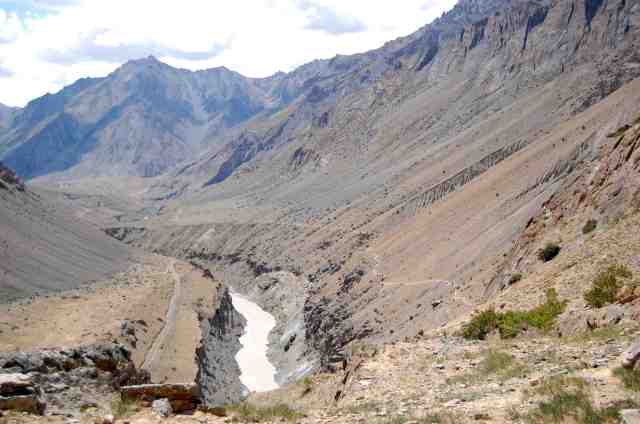 La vaste plaine, sorte de dépression au milieu des chaînes et des vallées qui confluent, est dure à parcourir sous un soleil de plomb et par plus de 40°C. D’autant que nous n’avons pas prévu assez de litres d’eau. Nos pipettes s’assèchent et le pas devient lourd. Cette plaine est un désert. Un arbre isolé prend les allures de celui (fameux) du Ténéré… un ruisseau qui serpente entre deux brins d’herbe est un court intermède à la sécheresse. En foulant un sol caillouteux, dont la boue sèche et grise garde de vieilles empreintes de passage de Jeep, nous rejoignons le bord de la rivière Zanskar. Elle est beige et tumultueuse. On raconte qu’elle est poissonneuse, mais la population bouddhiste a fait une croix sur le poisson, non par refus absolu de manger de la chair animale, car on veut bien à l’occasion décrocher des solives un vieux morceau de yak séché, mais parce qu’il faudrait tuer trop de poissons pour nourrir un seul homme, alors qu’un yak a lui seul peut nourrir une famille.