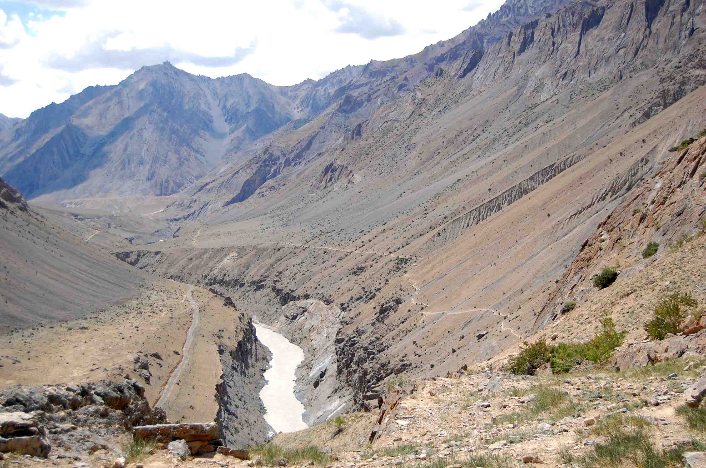 Le lendemain, nous repartirons comme si de rien n’était, traversant Zangla puis marchant de nouveau sur du plat, mais souvent au milieu des champs jusqu’à Hanumil. Et le surlendemain, nous suivrons de nouveau le cours de la Zanskar. En un sentier étroit, à flan de montagne, qui s’élève de plus en plus, avec la rivière en bas, presque à la verticale. Puis nous quitterons la Zanskar : le chemin s’élèvera jusqu’au Phensi la avec de là-haut une extraordinaire vue sur une gorge vertigineuse, au fond de laquelle il faudra descendre…. Pour remonter ensuite de l’autre côté. Jusqu’à Snyertse. Allons, la forme physique revient…
