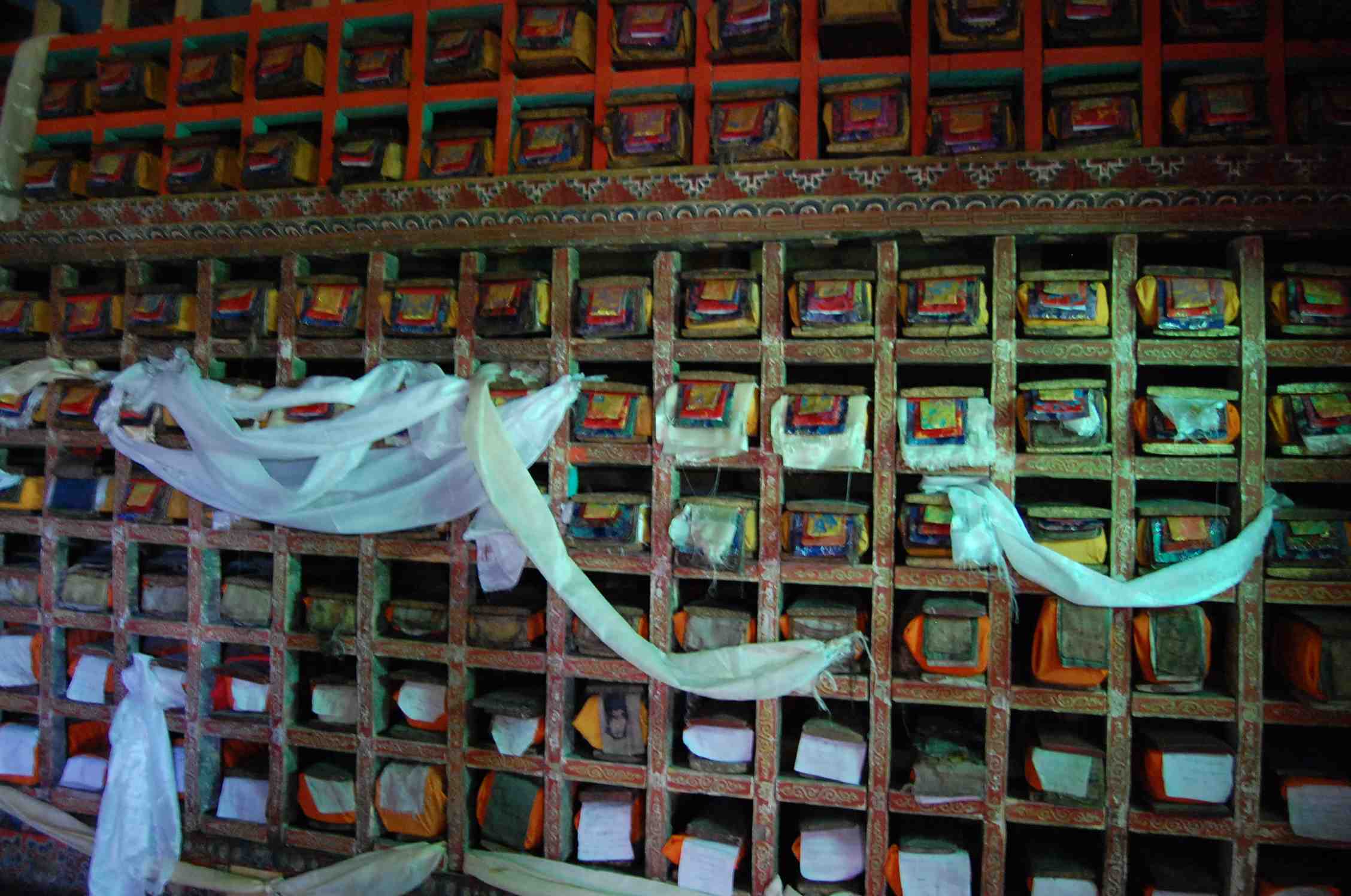 La plupart des monastères du Ladakh sont kargyudpas, quelques-uns sont gelugpas (Spituk, Thikse, Sankar, Karsha). Aucun n’est nyngmapa, un seul est sakyapa. Cette dernière branche semble s’illustrer au plan de l’ésotérisme. Une visite au monastère de Matho est une incursion dans un univers de BD. Ce n’est pas là que les fresques sont les plus belles (voir Stakna pour cela), ni les thankas les plus lumineuses. Au contraire, elles sont toutes noires de fumée et donnés pour être très anciennes (XVIème siècle). Surtout, la pièce des oracles attire l’attention : c’est là que sont entreposés les objets magiques, ustensiles de divination, masques « chams » utilisés lors des festivals. Un panneau surmonte la porte : interdit aux appareils photos, aux sacs et…. aux femmes ! Pour une raison qui me demeure inconnue, le sol est parsemé de graines.