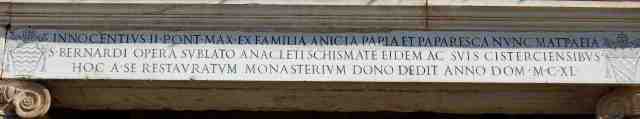 Paul est assez vraisemblable, puisqu’on lit dans les écritures qu’il fut en effet mis à mort non loin de la via Ostiense, proche d’ici, et que Saint Paul hors les murs est à peine à quelques dizaines de minutes à pied, encore cela était il y a quelques temps, un temps que l’Abbé a connu, lorsque l’espace n’avait pas encore été recouvert de nœuds autoroutiers et autres bretelles d’accès. Maintenant, c’est une autre histoire. C’est Saint Bernard de Clervaux qui vint ici sur les conseils d’un certain Bernardo Paganelli, moine du coin, pour y installer cette abbaye, ledit Bernardo qui devint par la suite rien moins que pape(*) – nous y voilà encore – alors que Saint Bernard, lui, dès les débuts de sa présence en ces lieux, devait prendre partie dans une querelle de papes, on le voit à ce qu’il prit grand soin de faire inscrire au fronton de l’abbaye :
