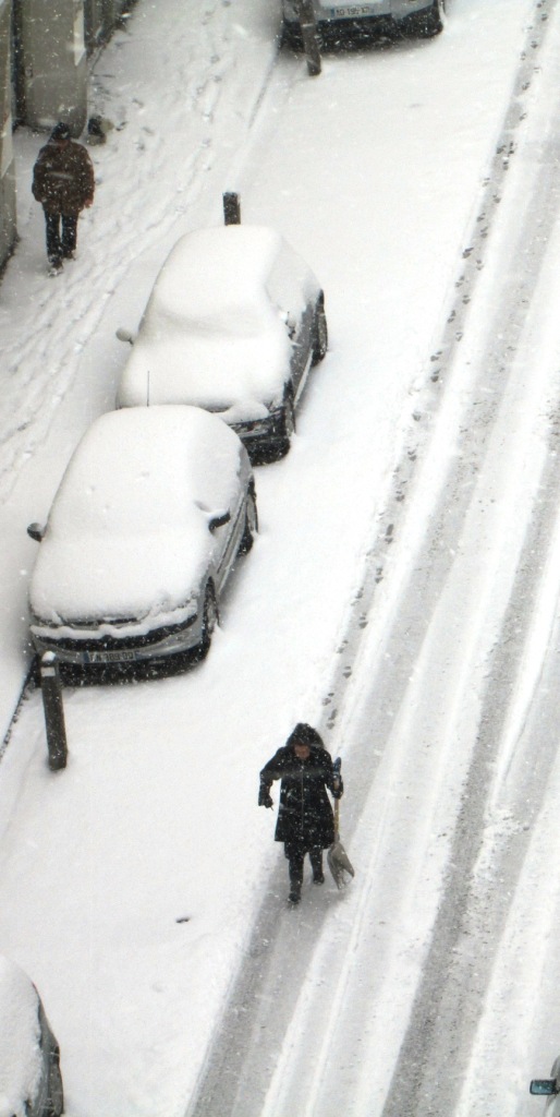 Le poème vient d’un volume récemment publié chez Zoé, « Au bureau », illustré par des gravures magnifiques dues à son frère Karl. Bien sûr, la neige en ville… mais noter toutefois que la dame en noir sur les deux photos du bas, est allée chercher une pelle, comme à la campagne, pour dégager son auto.