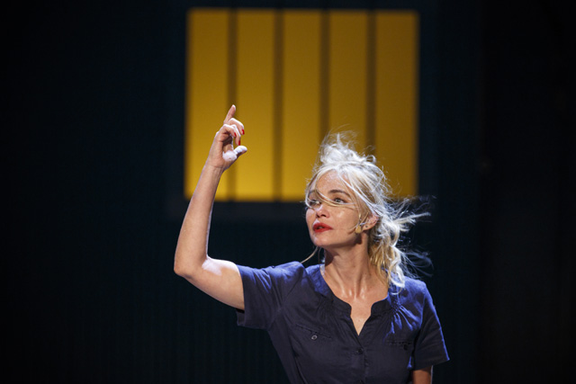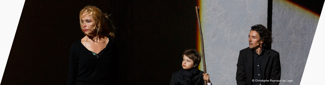 En seconde partie, le décor a changé. Nous sommes le long d’un cimetière mais Handke, paraît-il, dans ses didascalies, demande qu’on ne voie pas les tombes ni les croix, mais seulement des arbres, lesquels sont ici finement ciselés sur des toiles tendues. La pièce reprend sur un monologue d’Emmanuelle Béart, qui joue Sophie, la sœur, qui revendique sa liberté face à un frère qui l’écoute d’un front obtus. Magnifique diction d’Emmanuelle Béart (il n’est guère facile, pour les acteurs, de se faire entendre, comprendre, en ce lieu immense – beaucoup de spectateurs des derniers rangs en savent quelque chose, qui souvent, de guerre lasse, désertent leur place – Certes, ils ont des petits micros qui amplifient leurs voix mais ceux-ci ajoutent souvent de légers chuintements, il faut que les comédiens aient donc un phrasé qui détache les mots d’une façon particulière, ce à quoi Jeanne Balibar, notamment dans le fameux dernier monologue, arrivera avec plus de difficulté que les autres… du moins me semble-t-il). Si les rapports sont tendus entre le frère et la sœur, elle n’en finit pas moins cependant par rendre à Gregor un bel hommage : « ton problème c’est que la misère d’autrui tu la ressens comme si c’était la tienne. Et comme tu ne peux pas t’en rendre maître et que tu n’en tombes pas non plus raide mort, ce qui te sauve, c’est la transfiguration par laquelle tu nous crois sauvés […] Oui, tu n’as pas la faiblesse de rendre les choses inoffensives, mais la force de les transfigurer ».