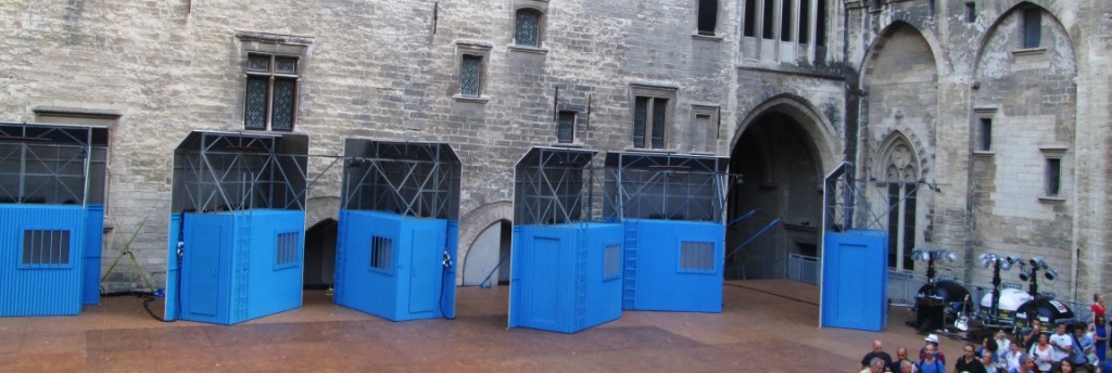 … de petites guérites bleues nous attendaient sur la scène, comme des cabanes de chantiers, ce qu’elles s’avérèrent être en effet, un peu plus tard, quand le spectacle fut commencé…