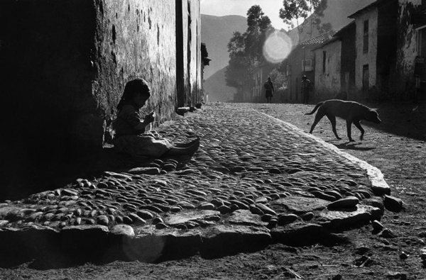 L’autre « grand » de ces rencontres est Sergio Larrain, chilien, mort l’an dernier dans un isolement complet qu’il a sciemment recherché. Sa période de photographie professionnelle fut relativement courte (des années cinquante aux soixante), après quoi, dans une attitude de farouche opposant à tout système et surtout à la commercialisation de l’art, il a fait un choix d’ermite, se retirant dans le désert chilien, passant par des phases de drogue, d’hallucinations, de yoga et de recueillement mystique, jusqu’à, apparemment, connaître la sérénité d’une retraite où personne ne pouvait le joindre. Quelques opiniâtres admirateurs arrivèrent néanmoins à forcer sa porte, à en rapporter des enregistrements et même un petit film, mais ce fut toujours à une condition : qu’on ne photographie jamais son visage. Ainsi est-il mort inconnu, si ce n’est de quelques visiteurs qui en parlent aujourd’hui comme d’un gourou (ceci dit dans un sens non péjoratif). Larrain, visiblement, avait une conception mystique de la photographie, produite selon lui par la conjonction miraculeuse d’un instant, d’un regard et d’une intention. Quand il n’a plus photographié, il a dessiné et colorié des objets ou des moments autour de lui, images qualifiées de « satori » car elles exprimaient la fulgurance d’une vision instantanée. Durant sa période photographique active (pour de grands magazines brésiliens ou pour Magnum), il a rapporté de ses nombreux voyages des vues saisissantes, en noir et blanc, d’un caractère profondément humaniste en même temps que d’une beauté formelle que l’on ne peut arrêter de contempler. La composition des photos, les lignes de force telles qu’elles se combinent, horizontales, verticales, obliques, donnent le sentiment d’un équilibre qui fait de chaque photo un monde en lui-même. Une masure à la vitre brisée et l’ombre d’un arbre déchiqueté, et c’est aussitôt la beauté formelle d’un Mondrian. Une petite fille qui descend un escalier dont la rampe fait un arrondi, sur un fond de tôle ondulée et on croit voir la grâce de l’Art Nouveau. « La danse des démons », à Independencia, Bolivie (1958) vous a des airs d’un Breughel noir et blanc… Cinq marches d’escalier au Macchu Pichu suffisent à rendre la noblesse des monuments incas. Et pour moi, la plus belle de toutes est une photo prise à Pisac (Pérou). Un chemin oblique sur la droite, délimité par un rebord de trottoir qui monte du coin en bas à droite vers le centre de la photo, un trottoir aux pierres rondes et luisantes, un mur blanc occupant la moitié gauche, sur le chemin à droite un chien errant, sur le trottoir à gauche une petite fille assise contre le mur qui tient un écheveau de fils entre ses doigts. Le soleil fait un halo dans l’objectif. Au loin, un paysan courbé monte une côte.