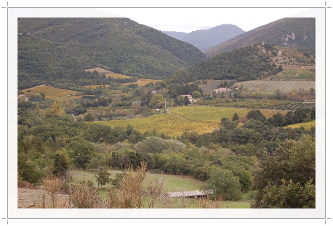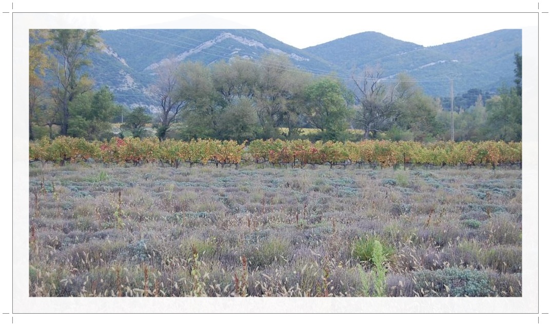 La lavande la vigne rouge feu des hameaux protestants. Le calcaire strié les plissements d’ailes les vautours sur la plaine en verticale des champs, la meute ouverte / chasse à gros gibier/ fontaine de sang près des sorbiers sauvages. Et on dit toute la couleur, la lumière qui semble unique et venir de l’intérieur des montagnes la marche en silence au creux des épaules calcaires aisselles couchées.