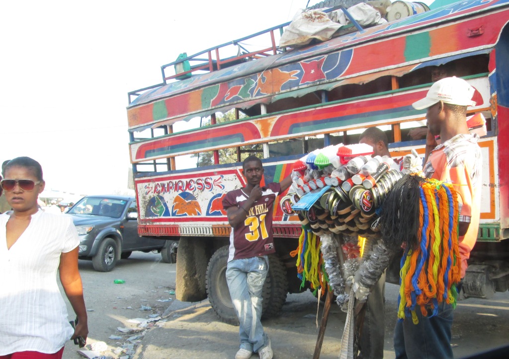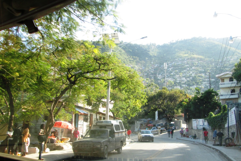 « On les entendait pleurer ». C’est ce qu’il me dit en passant devant un espace occupé aujourd’hui par un hangar mais autrefois par un bel immeuble. « Oui, et on ne pouvait rien faire pour eux car ils étaient coincés sous des blocs de béton trop lourds ». Le souvenir du 12 janvier, encore. Du goudougoudou, comme on l’appelle. « Il », c’est mon interlocuteur principal, R. G. , qui me balade dans sa voiture dans les rues du haut de Port-au-Prince. Quartier Canapé-Vert, puis Petionville, autrefois lieu résidentiel pour les plus fortunés, mais ville où s’est réfugié l’essentiel de l’activité commerçante depuis la date fatidique, car elle a été relativement peu touchée. Nous avançons au pas au milieu d’une foule bruyante et plutôt joyeuse. Si ce n’étaient ces souvenirs évoqués de temps à autre, on oublierait qu’il y a eu catastrophe. Nous franchissons un ravin qui, en principe, ne devrait pas être construit, mais comment empêcher les gens qui n’ont plus rien de s’installer. Sur les pentes s’échelonnent des bidonvilles, du genre favelas, mais que le gouvernement… a fait peindre de toutes les couleurs pour faire plus joyeux. C’est là ce qu’on appelle repeindre la misère.