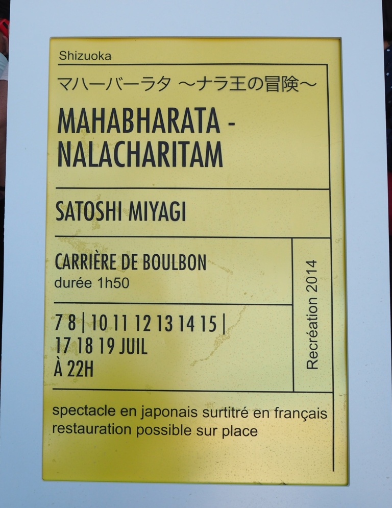 Petites routes, traversée du Rhône, fleuve épanoui en cet endroit, terre ocre et buissons de genets verts bouteille, petites carrières, maisons basses, chant des cigales, torpeur du soir, file de voyageurs / spectateurs claudiquant sur les pierres, spectatrices élégantes se tordant les pieds parce que chaussées de talons aiguille, pour arriver à la Carrière de Boulbon, magnifique emplacement, en usage pour le festival d’Avignon depuis, je crois, que Peter Brook décida d’y jouer le Mahabharata. Eh bien, justement, c’est la reprise dudit Mahabharata, mais dans une toute autre version, par un tout autre metteur en scène, et bien plus court, seulement une heure cinquante est prévue, là où autrefois, ce devait être huit ou dix heures… C’est un grand réalisateur japonais qui s’y colle, c’est Satoshi Miyagi (avec son Kanagawa Arts Theater), pour en réalité un court épisode, peu connu, de la grande épopée indienne : le Nalacharitam, c’est-à-dire l’histoire du roi Nala.