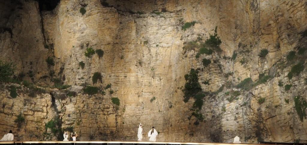 Vu de ma modeste place, sise au tout dernier rang – le « U » pour les bien informés – ce que je vois, outre un immense mur de scène naturel fourni par la roche calcaire, c’est au loin un plateau circulaire (dont l’extrémité opposée à la scène passe derrière moi) sur lequel apparaissent et disparaissent des ombres inversées, entendez par là des formes blanches : acteurs mimant leur rôle, récitant, et ce qui ressemble à de grands découpages de papier pour figurer les monstres ou les arbres de la forêt. De temps en temps, les personnages secondaires, courant sur cet anneau, viennent faire mourir leur course derrière notre dos. Et, entre le public et la scène, juste en dessous de la ligne du regard, l’orchestre de percussions, une dizaine de musiciens, eux aussi vêtus de blanc, tapant sur leurs instruments avec de grands gestes, scandant l’histoire en alternance avec la voix du récitant, lui se tenant presque accroupi et, comme le spectacle ne manque pas d’humour, tout à coup disant des mots en français et même chantant… « Sur le Pont d’Avignon, on y danse, on y danse… ! ». A la fin, quand tout le monde sur scène est parti, la musique joue encore, tandis que chaque musicien tour à tour quitte sa place jusqu’à ce qu’il n’y en ait plus qu’une, la chef, Ayako Terauchi. Vu de ma modeste place… je ne vois que ça et je trouve que c’est déjà beau. Imaginez tout de même ma rage quand je découvre a posteriori, sur des sites officiels ou des blogs amis, ces photos de gros plans de visages que je ne verrai jamais en vrai, et dont les spectateurs des derniers rangs seront à jamais frustrés… Ah bon, c’était ça, le Mahabharata de Miyagi ? je ne le savais pas. Comme un malvoyant qui découvre enfin le parfait usage de la vue et s’émerveille après coup de ce qu’il aurait du voir… s’il l’avait pu. J’ai pourtant commandé mes places très tôt… Dites, ceux qui savent et vont à Avignon souvent : il y a un truc ? je veux dire une manière de s’assurer de bonnes places, sur le devant si possible, lorsque les spectacles le demandent à ce point ?