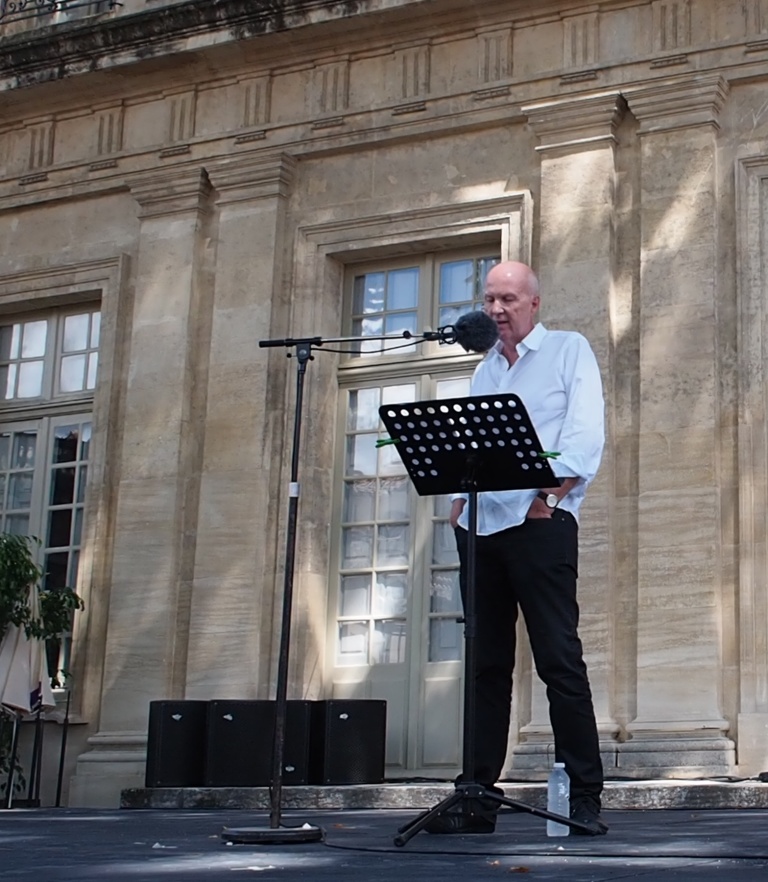 Dans un autre récit (« La vérité sur Marie »), il est question d’un pur-sang qu’il faut embarquer dans la zone de transit de l’aéroport de Narita, cela occupe le cinquième du roman et c’est fascinant : littérature où le texte est fait pour nous transporter dans un ailleurs indécidable, sommes-nous à Tokyo, chez nous, à Avignon ? je me souviens avoir lu ce passage dans le métro à Paris : j’étais dans ma bulle, et pourtant sur la ligne 13… Jean-Philippe Toussaint a un site Internet que je recommande : on y suit à la trace ses personnages et ses projets d’écriture, et ses projets de films. Lorsqu’en cette cour du musée Calvet, la lecture s’interrompt, on en voudrait encore et encore bien sûr, c’est comme une musique qui tout à coup s’est interrompue, ou comme un rêve, dont on a été réveillé trop tôt.