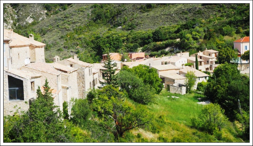 C’est ici. C’est celle qui a la façade en crépis et un toit de tuiles provençales. Un alignement de trois fenêtres dont les volets sont du bleu de la lavande. Elle regarde vers le bas, vers la route montant de la vallée et du bourg où l’on peut se recharger en victuailles. Il doit bien y avoir là-bas une épicerie. Une boulangerie. Un café. Peut-être même on peut y manger, dans ce café. Puis, plus loin, un lavoir au bord d’un ruisseau. Une rivière. La route de Nyons. Mais rien de tout cela dans ce village-ci. Juste devant, il y a un arbre qu’on n’aperçoit pas sur la photo. C’est un olivier. Seul bout de terrain. Il est en forme de lunule. Il a été probablement mis là pour que ce soit plus facile pour les paysans d’autrefois d’entrer leur charrette et leurs trois chèvres dans la cave voutée qui sert de rez-de-chaussée, c’est donc un léger coude pour permettre un virage. Devenu depuis inutile. On ne se sert plus de la cave pour y entrer un véhicule. Des animaux. Alors on a fait pousser dessus un olivier. Il donne des fruits. Il vit. Sur le mur latéral, celui qui n’est pas adossé à une autre maison, pousse un figuier. Lui aussi donne des fruits. Il paraît qu’en été les voyageurs – ceux qui marchent le long d’un GR qui passe par là, ou bien les cyclistes, qui aiment à se promener par ici, en ce lieu qui n’est pas si loin du Mont Ventoux, haut lieu du cyclisme mondial – s’arrêtent pour manger des figues. Grand bien leur fasse. Je ne mangerai pas toutes les figues. Ce qu’on voit comme verdure juste devant la maison, c’est une vigne, qui sert de tonnelle au-dessus de la petite terrasse à laquelle on accède par un escalier aux marches inégales de grosses pierres ocre et grises. Derrière la maison, il y a une ruelle, qu’on ne voit pas ici bien sûr. Mais immédiatement au-delà, c’est la colline qui commence, pleine de verdure, de buis, de cistes et de chênes verts. De ci de là un pin, surtout quand on monte vers le col, juste au-dessus du village, et par lequel on arrive, venant de la route de Remuzat. Vous vous souvenez de Remuzat, que Barbara chantait. De temps en temps, dans le ciel, tournoient des vautours, qui viennent d’un élevage tout près de ce village. En avant de la photo, plus loin que l’endroit d’où la photo est prise, le village se prolonge par un promontoire qui domine la vallée, d’où l’on voit très bien le Mont Ventoux. Les soirs d’été, on n’y entend que les grillons.