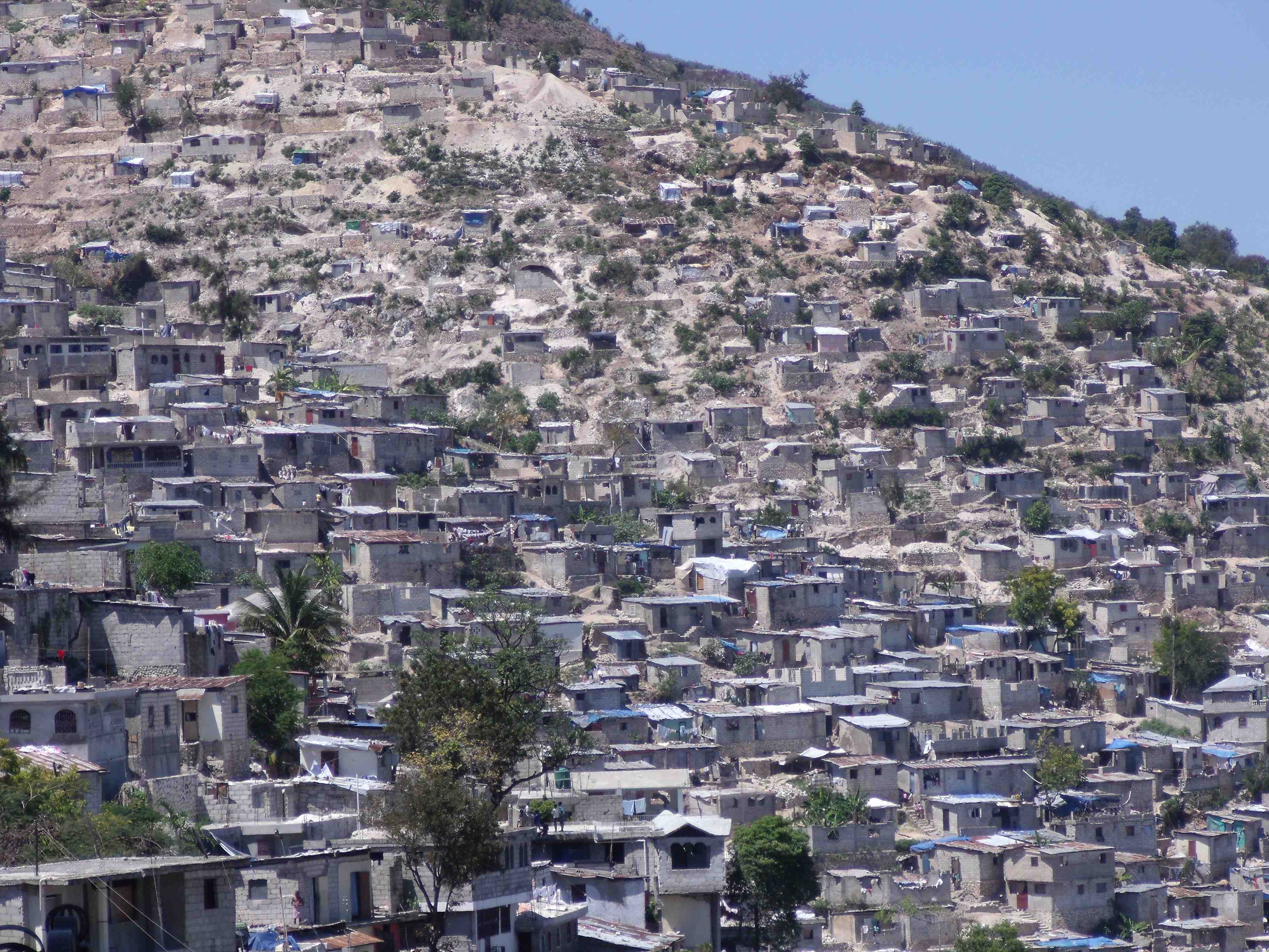 La population de Port-au-Prince est énorme, mais difficilement évaluable compte tenu de l’absence de recensement possible et de son accroissement incessant, les estimations varient entre un million deux cent mille et trois millions cinq cent mille. Les gens construisent des habitats de fortune, sortes de cubes de ciment, terre battue ou ferraille sur les pentes abruptes des « mornes » (collines) qui surplombent la ville basse (d’autant que c’est une partie de la ville qui a été moins touchée par le tremblement de terre de 2010). Lorsqu’on circule en voiture sur la route en lacets qui monte de Port-au-Prince à Pétionville, à partir du lieudit « Le canapé vert », on est stupéfait de se trouver face à un mur, de l’autre côté du ravin : c’est un mur dressé vers le ciel, qui n’est fait que de ces habitations de fortune. Un peu plus loin, ce mur se pare de couleurs gaies. R. G. me dit que la peinture a été payée par l’actuel régime. Ils ont repeint la misère, me dit-il.