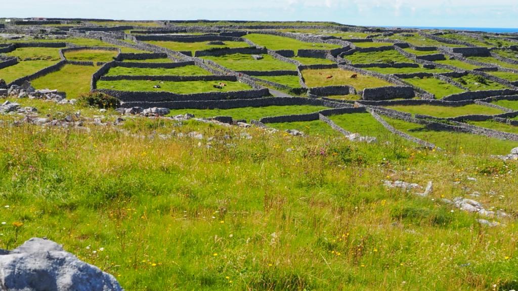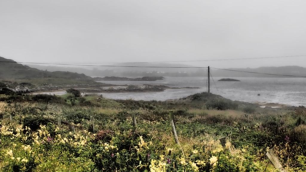 Dommage de ne pas être allé voir les murs en ruines de Clon-mac-noise, tout près d’Athlone, pour faire comme Nicolas Bouvier (« le journal d’Aran ») et voir si vraiment la plus grande abbaye d’Europe tient encore le coup après mille cinq cents ans… dommage de n’avoir pu aller près du château de Dun Angus, sur la côte ouest de la plus grande des îles d’Aran, à ouïr « les coups de boutoir de la mer , à entendre le vent me braire au nez en tirant comme un voleur ses couvertures de brume » avant de « redescendre en musardant vers les anses de l’est », mais nous n’avions pas réservé de places sur le bateau au départ de Doolin et il était plein, nous n’avions plus qu’à nous rabattre sur la plus petite des îles, qui n’est pas mal non plus et qui a un château aussi, mais en un lieu plus paisible, baigné par les grandes étendues d’herbe morcelées en multiples parcelles par des murs de pierres sèches aux motifs tous différents, comme les mailles d’un pull over tricoté avec la laine des moutons blancs. Dommage de n’avoir vu la péninsule de Renvyle que sous la pluie, ne percevant rien au-delà de quelques centaines de mètres, mais heureusement la vision de l’abbaye de Kylemore se supportait bien d’une avalanche de brume. Mais si l’on n’ajoutait que les regrets, où irions-nous. C’était beau aussi de voir l’eau bouillonner au sortir des montagnes de mousse et terriblement spectaculaire d’assister au déchirement vespéral de la couverture nuageuse pour laisser paraître les rayons d’un soleil neuf, qui guettait dans l’ombre, prêt à incendier les eaux de la baie de Galway, au large de Fanore, près de Ballyvaughan. La pluie quand même était dominante, c’est elle qui effaçait les lointains pour mieux faire surgir un dolmen ou une tour ronde abritant une salle de musique (Newtown Castle), mais elle se retirait parfois et le calcaire des collines de Burren aussitôt séchait, blanchissait, parcouru qu’il était par de longues crevasses et couronné lui aussi de quelque château ancien dont il ne reste que la base et qui peut servir d’enclos à quelques vaches mouillées.