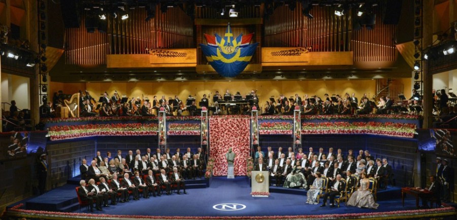 The ten 2016 Nobel laureates in literature, medicine, chemistry, physics and economics are seated, front row left, across from King Carl XVI Gustaf of Sweden and the royal family during the 2016 Nobel prize award ceremony at the Stockholm Concert Hall on Saturday Dec. 10, 2016. (Jessica Gow/TT News Agency)/LBJ809/595512843842/SWEDEN OUT/1612101736