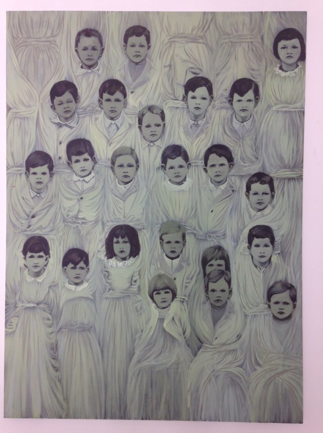 Tabouret, Claire, peintre née en 1981 à Pertuis, est exposée en ce moment à la collection Lambert d’Avignon sous le titre : Les Veilleurs. J’aime beaucoup les tableaux de Claire Tabouret. Elle est experte en visages, des visages avec des couleurs mates, à plat, avec des teintes claires qui naviguent autour des formes et aussi parfois de drôles de taches qui maculent l’entour de la bouche ou des yeux, brouillant le regard, elle réunit aussi des visages dans de grandes compositions qui ressemblent à des photos d’école ou de choeur. L’une de ces compositions a été retenue comme affiche du festival In, les regards des enfants se posent sur nous comme des papillons envolés tout à coup d’un massif de fleurs.