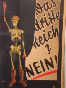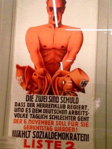 La République de Weimar, conduite par les sociaux-démocrates, fit face à une situation économique qui n’arrêtait pas de se dégrader et à l’intransigeance des puissances victorieuses (France, Belgique) punissant tout manquement à la dette (occupation de la Ruhr en 1923). Et cela jusqu’à l’avènement des mouvements d’extrême-droite, des milices, de la NSDAP au travers d’une situation sociale explosive et d’une manipulation du peuple par les officines de propagande. Tout cela exposé dans des vitrines qui contiennent une masse parfois confuse d’archives, de photos, d’articles de journaux, d’affiches dont on admirerait le graphisme plein de modernisme provoquant si nous ne savions que derrière se cachent des affrontements ultra-violents.