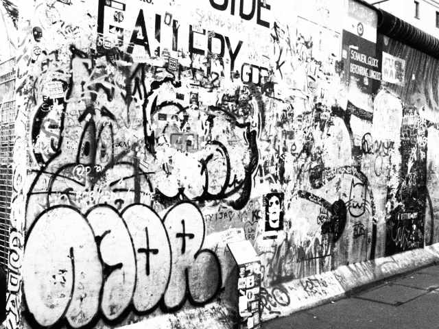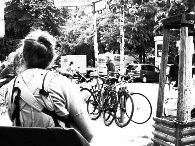 Le Mur, parlons-en. On le retrouve sur un peu plus de un kilomètre au bord de la Spree, près du pont Oberbaumbrücke et des stations Ostbahnhof et Warschauer Strasse, à la limite du quartier occidental de Kreuzberg. Là, des Berlinois de l’Est perdirent la vie en voulant traverser à la nage. Aujourd’hui, on appelle cette portion de mur la East Gallery, à cause des fresques murales, souvent fort belles, qui y ont été réalisées. Occasion de méditer sur ce qui fut sans doute la plus importante et l’ultime tentative de dresser une barrière entre deux modes de vie et contre le capitalisme marchand. Je me souviens de l’écrivain Heiner Müller qui déclarait lors d’une interview sur son passé à l’Est que la société est-allemande avait au moins l’avantage de porter une éthique de la pauvreté (mais en est-il d’autres ?). Il voulait parler bien entendu du peuple est-allemand et pas de ses dirigeants (dont on sait, eux, que, par ailleurs ils amassaient des fortunes dans les banques suisses). D’Ostbahnhof part une large avenue typique des architectures de l’Est, bordée de barres de logements dans le style de nos HLM de banlieue, qui répond au nom émouvant pour nous Français d’Avenue de la Commune de Paris. J’y prends un bus – le 240 pour être précis – qui me conduit au cœur de Friedrichshain, sur la petite Boxhagener Platz, havre de paix peuplé de gens à vélo que d’aucuns appelleraient des bobos… mères de famille portant bébé, rescapés de l’ère hard rock, étudiants Erasmus grignotant salades bio à l’angle d’une rue bordée d’arbres qui se balancent… Non loin de la Simon-Dach Strasse, autrefois célèbre pour ses boîtes enfiévrées mais qui n’offre guère aujourd’hui, en tout cas l’après-midi, que des terrasses ombragées où il fait bon prendre un café voire même piquer une petite sieste assis adossé à un mur.