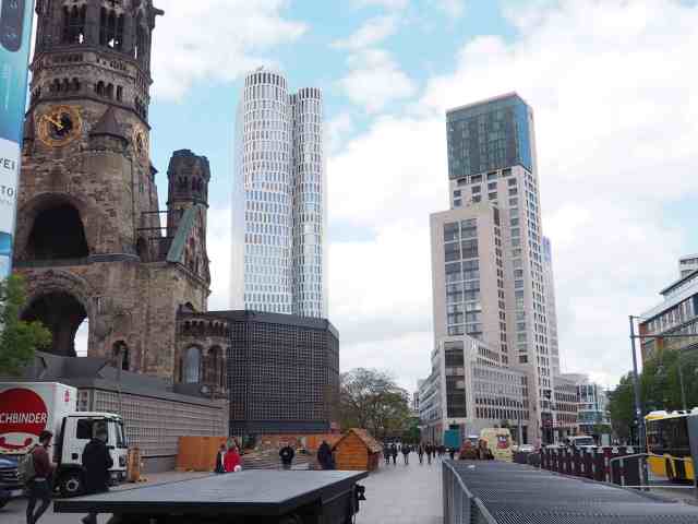 Le lendemain, on découvre d’abord Kurfürstendamm à la hauteur de l’Institut de France, les magasins de luxe, les Champs-Elysées de Berlin jusqu’à Zoologischer Garten, l’église du Souvenir cette fois en plein jour, travail des vitraux bleus fait par un certain Gabriel Loire, maître-verrier, mosaïque représentant Guillaume 1er. Les vastes trottoirs parsemés de chalets de saucisses au curry (berliner currywurst, j’ai testé et n’ai pas trouvé cela très bon, saucisse découpée en morceaux avec une sauce ketchup un peu relevée) même et surtout devant le bloc imposant et gris du KaDeWe, Kaufhaus des Westens, ex-vitrine de l’Ouest, toujours vitrine du luxe. Wittenberg Bahnhof avec un goût d’antiquité précédant la catastrophe, et à l’entrée, la liste des camps de déportation. Prendre le U2 jusqu’à Potsdam Platz, le pendant à l’ouest de l’Alexander Platz, restes dérisoires de mur de Berlin, sanctuarisés par le centre culturel coréen qui fait le parallèle avec son propre mur qui divise la Corée depuis 1945. Immeubles de verre et de béton, temples de la technologie (Sony), tours, architectures qui furent autrefois futuristes mais ont aujourd’hui comme un relent de passé, la révolution architecturale serait-elle aussi dépassée ?