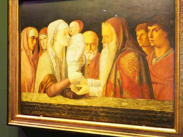 Jésus est toujours emmailloté, Joseph toujours en arrière-plan, le grand prêtre est moins riche de parures mais les personnages autour ont changé. Bellini a gardé exactement la même composition, mais chez lui, les personnages sont appuyés sur un rebord en marbre, et non sur un cadre en bois, ce qui fait plus riche et permet déjà de sentir que la seconde « présentation » est destinée à quelque riche négociant de Venise, alors que la première peut-être n’était destinée qu’à une modeste église.