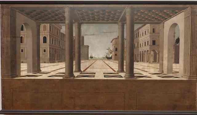 Un pas de côté, on change de salle (au hasard…) et l’on tombe sur la Cité idéale… un fantasme ou un décor inspiré, dû à Francesco di Giorgio Martini (vers 1500), semblable à d’autres toiles qui sont à Urbino, chez le duc de Montafeltre. Ce tableau laisse à méditer. Mais de quelle cité idéale peut-il s’agir ? Idéale parce que géométrique ? Idéale parce que sans humains ? La place est déserte… seul un vaisseau au loin semble attendre d’improbables voyageurs. Image d’après l’anéantissement ? Où il ne resterait plus âme qui vive ? Plus personne pour embarquer ? Ou bien plus prosaïquement tentative de concevoir un décor de théâtre. Sur le devant, une loggia à colonnes aménage un sas entre notre monde de spectateur et la réalité virtuelle du tableau. On pourrait attendre longtemps pour voir apparaître une belle dame de la Renaissance qui irait d’un bord à l’autre…