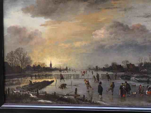 Et puis un tour par les paysages de Hollande, comme ce magnifique étang gelé où virevoltent les patineurs (« il patinait merveilleusement / s’élançant impétueusement / … »). Très beau reflet du soleil sur la surface de glace, effet de profondeur créé par le rapetissement des silhouettes avec les arbres dépouillés qui se répondent d’une rive à l’autre. C’est un tableau de Aert van der Neer qui doit dater des environs de 1655. Contrairement à ce qu’on a pu croire, les hivers n’étaient pas si froids en Hollande vers ces années-là, cette vue est donc exceptionnelle.