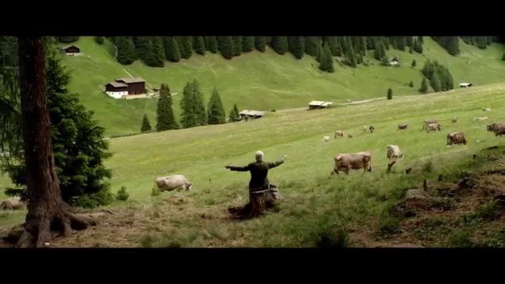Film superbe à voir plusieurs fois pour mieux s’imprégner des images, des sons (très belle musique de David Lang) et des nombreuses scènes inattendues qui émaillent ce récit à la fois drôle et tragique. Car ce film est une succession de scènes qui souvent se suffisent à elles-mêmes. J’évoquais l’autre semaine celle où l’on voit le chef d’orchestre et compositeur Fred Ballinger, joué par Michaël Caine, en train de diriger une symphonie de meuglements de vaches, de souffles de vent et d’envols d’oiseaux. Admirable scène où l’humour se mêle au sentiment de la nature, ce qui n’est pas si fréquent. Mais dans un autre ordre d’idée, on peut aussi mentionner la scène des larmes de sa fille Léna (qui est en même temps son assistante)(jouée par Rachel Weisz) qui vient de se faire plaquer par Lucas(*), fils de Mick, le cinéaste, autre personnage central, et joué par Harvey Keitel ; et la scène qui suit où allongée sur le lit aux côtés de son père, elle lui fait le procès que toute fille fait à son géniteur (ou à peu près) : qu’il ne l’a pas assez prise en considération pendant sa jeunesse, qu’il était toujours ailleurs, ici dans sa musique, sa satanée musique. Ou bien encore, les scènes cocasses où un couple hébergé dans le même luxueux hôtel (quelque part dans les Grisons) mange chaque soir dans l’immense salle de restaurant en n’échangeant jamais le moindre mot, ce qui débouche sur une bonne gifle assénée par la femme à l’homme, puis plus tard sur une scène d’amour sauvage contre un tronc d’arbre : ils se sont manifestement réconciliés… Scènes aussi où un Maradona plus ou moins réel, devenu énorme et perclus d’emphysème signe des autographes, nage péniblement dans la piscine (avec un gigantesque Karl Marx tatoué sur le dos) et de temps en temps rêve à sa gloire passée. Scènes encore auxquelles participe un jeune acteur d’Hollywood, joué par Paul Dano, venu là pour répéter un rôle qui s’avérera un curieux rôle… jeune acteur qui se croit très intelligent, très subtil, qui se plaint de n’être toujours identifié qu’à un seul rôle, celui où il incarnait « un robot dans Mister Q »… compatissant à l’égard du musicien mais dédaigneux à tort à l’égard de Miss Univers (la roumaine Madalina Ghenea) qu’il prend pour une bécasse alors qu’elle se montre pleine d’empathie et d’amitié pour le jeune acteur, et modeste en plus, et qui sait parfaitement répondre aux mots déplaisants du jeune gommeux. Scènes encore où le cinéaste venu mettre un terme à sa carrière au moyen d’un film testament qu’il promet d’être son œuvre maîtresse revoit en songe les femmes qu’il a fait jouer dans ses films, toutes disséminées sur une prairie vert pomme. Et surtout, surtout, scène de retrouvailles entre lui et son actrice fétiche, à qui il réserve le rôle central, laquelle est jouée par Jane Fonda (qui reçut un prix aux Golden Globes pour cela), et qui lui réserve la mauvaise surprise de renoncer à tenir ce rôle parce qu’elle a pris un autre engagement dans… une série télévisée où elle sera bien mieux payée (ce qui lui permettra de payer ses dettes et de s’offrir la villa en Floride dont elle a toujours rêvé) ! Un peu plus tard, la même ayant repris l’avion pour retourner à Los Angeles sera prise d’une crise de remords et voudra redescendre à tout prix ! Maintenue par les hôtesses au sol, désespérée. L’artifice de la mise en scène fera descendre immédiatement après un parachute se posant aux pieds de Fred… « je n’étais pas censé atterrir ici » dit-il…