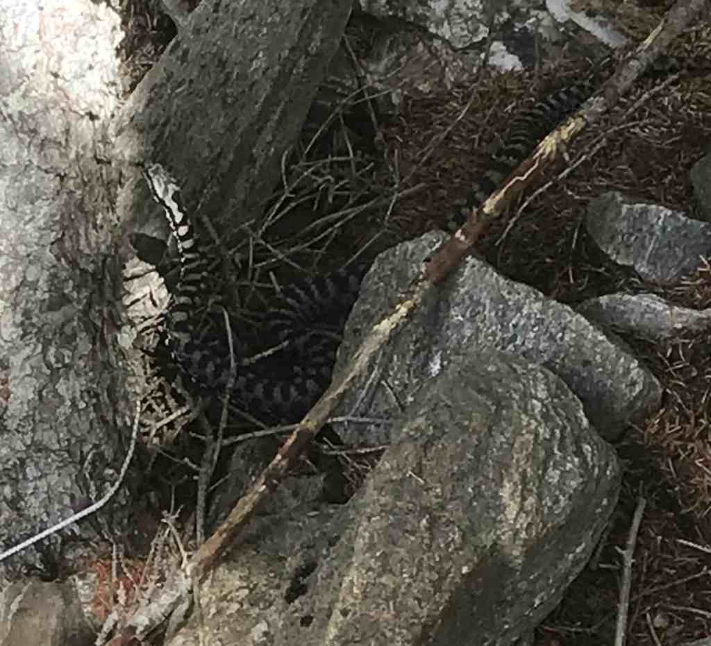 Nous marchions fin août dans une forêt valaisanne, toute proche de la petite station de La Fouly et nous étions assis sur un rocher pour grignoter. Tout en mâchonnant mon sandwich, je me demandais ce qu’était cette forme allongée que je voyais à deux mètres de moi, au pied d’un mélèze, immobile, ressemblant à une pomme de pin mais c’était trop long, à une branche morte mais c’était trop brillant, quand soudain, je réalisais : c’était une vipère qui dormait. Loin de vouloir la déranger, je me suis approché pour la photographier avec mon smartphone, puis C. est venue, le bruit de ses pas l’a faite frémir, elle s’est enroulée et a fui contre une pierre, j’ai pu néanmoins la prendre en photo. En d’autres temps, je ne l’aurais pas vue. Vipère ou panthère, souvent je commets ce lapsus. La première a de la seconde le corps tacheté, les sens en alerte et le regard fascinant, elle se cache tout pareil et fuit bien vite à l’approche de l’humain, elle a plus peur de nous que nous d’elle (et ce n’est pas peu dire!). Celle que j’ai vue appartient vraisemblablement à l’espèce dite « de Walser », une espèce surtout présente dans l’ouest des Alpes italiennes mais qui, ces dernières années, serait devenue plus fréquente au Valais (nous ne sommes qu’à quelques dizaines de kilomètres du Val d’Aoste).