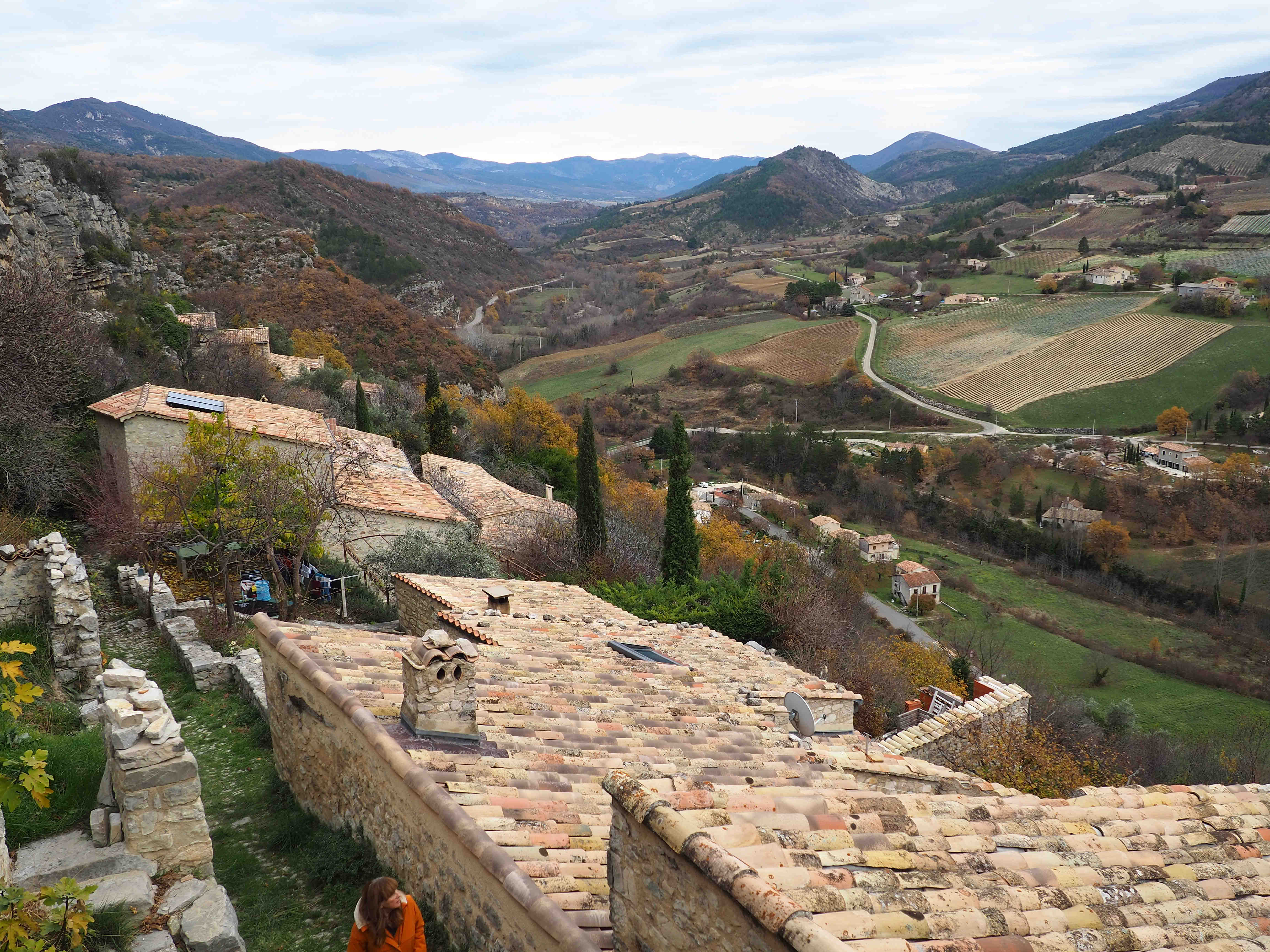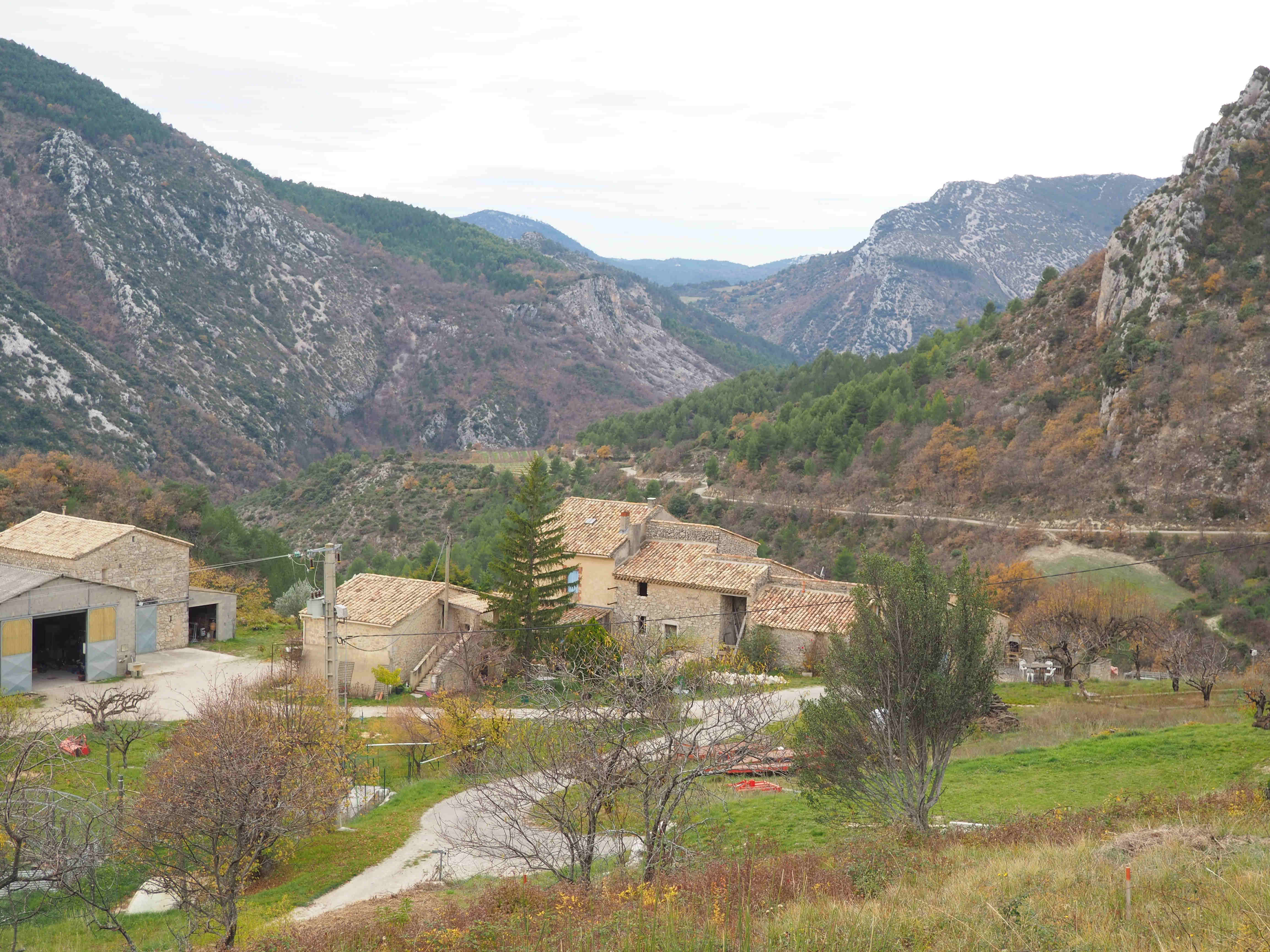 Le col d’Ey sépare la vallée de Sainte-Jalle où nous sommes, de celle de l’Ouvèze qui descend vers Buis, au sud. Mais si on remonte ladite vallée, on rencontrera sur la rive droite d’abord deux petits villages, Autanne et Vercoiran. Le premier est accroché à une pente raide, on y accède par une route étroite, avec peu de virages, qui monte directement vers ce bloc de fermes et de maisons de village, avec son petit cimetière qui ne contient guère plus de quatre ou cinq tombes à l’ombre de hauts cyprès. Nous nous garons là. Le reste, à faire à pied, conduit à une minuscule église dont la base est faite de deux bassins, était-ce un lavoir autrefois ? ou bien des fonds baptismaux ? Le livre de Patrick Ollivier-Elliott (très précieux) sur les villages des environs nous engage à entrer dans l’église, nous y verrions des tableaux anciens (XVIIIème), une Vierge dorée et un Christ polychrome, mais hélas, la porte est fermée. Plus haut que cette église et que quelques grandes bâtisses, un chemin s’élance entre vergers, vignes et champs d’oliviers, on a de là une vue resplendissante sur la vallée et l’on voit poindre le village suivant que nous pourrions atteindre à pied assez rapidement si nous n’avions laissé au cimetière, cette satanée voiture qu’on ne saurait laisser là… Alors, nous allons à Vercoiran, qui se divise en deux parties, celle du bas est au bord de la route, un ancien moulin aujourd’hui occupé par un restaurant et un magasin de charcuterie qui a très bonne réputation, et la plus élevée est celle que nous voyions de loin, construite en contre-bas d’un donjon massif posé à même le rocher. Une rue s’enroule autour de celui-ci, et une autre rue est un peu plus basse, certaines maisons doivent être au moins du XIIIème siècle. Au-delà de la base de ce donjon, s’étend une plaine, dominée par la courte chaîne de la Serrière, cette plaine contient des constructions plus récentes, et un banc en demi-cercle avec un bassin et une plaque commémorative. Reprenant la voiture, nous passons au Moulin, prendre quelques victuailles qui s’avéreront excellentes. La route continue sur cette rive droite de l’Ouvèze, se faisant parfois étroite, parfois surplombée de rochers en équilibre, et le village suivant est Sainte Euphémie sur Ouvèze. Une curieuse histoire fait de ce village une ancienne possession des princes de Monaco, histoire d’un lointain échange entre le royaume de Naples et… ce tout petit bout de terre de Provence. Ici, les religions se sont affrontées comme un peu partout dans le Sud-Est de la France (le Luberon a connu aussi son lot de batailles et de massacres), elles ont du trouver un modus vivendi puisque sur la même place, aux deux extrémités, on trouve ici l’église et le temple protestant. Ce dernier a toutefois l’air plus vivant que sa voisine d’en face : la maison est habitée. Je vois dans une lanterne, le programme des cultes et des réunions périodiques où se retrouvent les ouailles d’un peu toute la Drôme du Sud, de Nyons à La Motte-Chalencon. Le village fut fortifié, on y entrait par des portes qui restent en état, dans l’une d’elles sont accrochées de vieilles échelles qui servaient (et servent peut-être encore aujourd’hui?) à la cueillette du tilleul (le tilleul est une grande richesse des Baronnies). Sortant du village pour rejoindre la route, nos pas croisent ceux d’un aimable habitant des lieux qui nous renseigne sur une pancarte qui nous intrigue, posée contre un vieux mûrier, où il est dit que cet arbre fut planté en 1732. Nous savons ainsi que, cette année là, le roi Louis XV, afin de fêter son mariage avec Marie Leszczynska, offrit un peu partout des mûriers. La soie, autre richesse de la région. C’est l’hiver, tard en novembre, le soleil est déjà prêt à disparaître derrière les barrières de calcaire, nous n’aurons pas le temps de visiter Saint Auban sur l’Ouvèze, mais nous repasserons dans notre vallée par le col de Peyruergue.