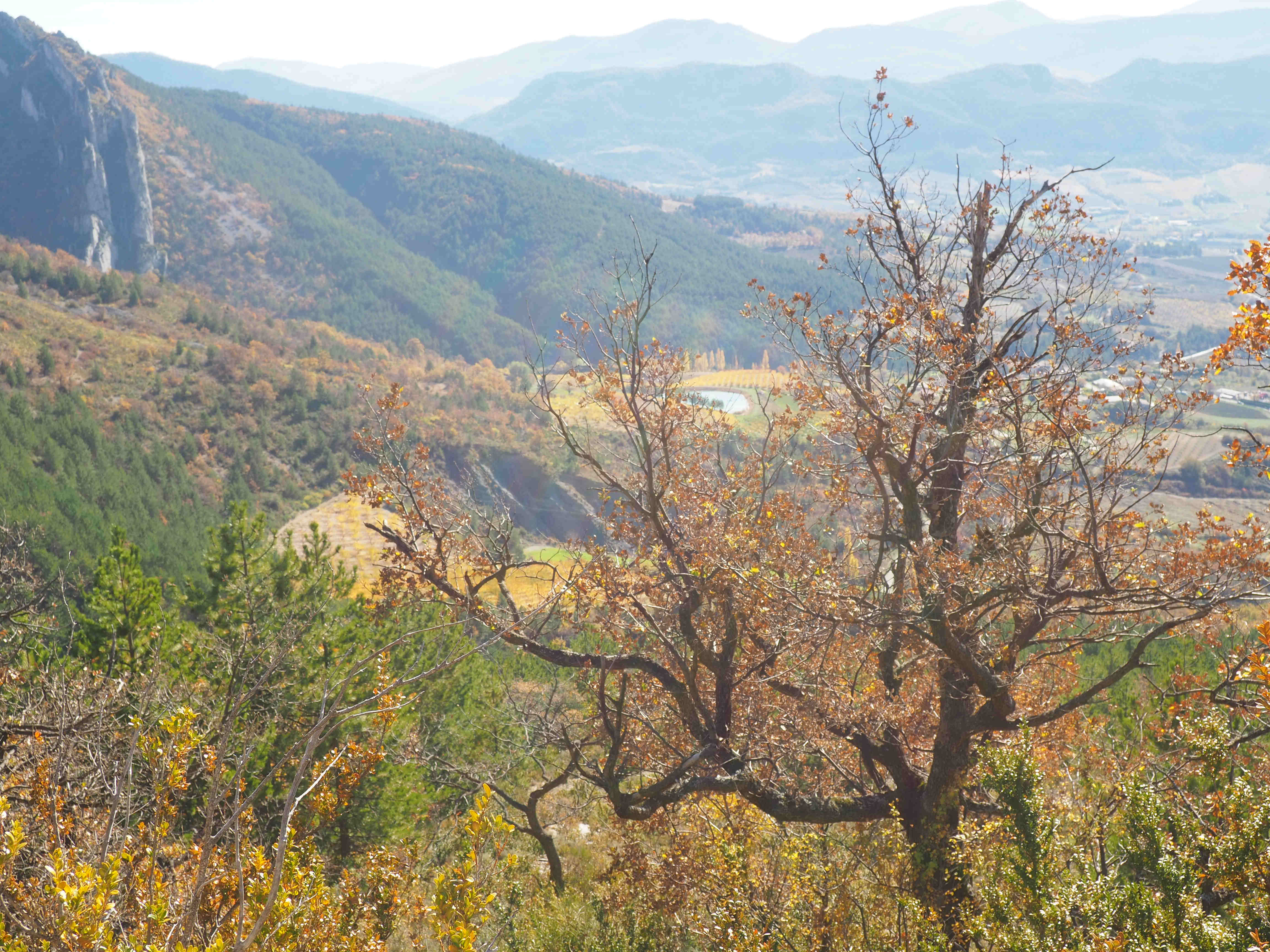 Le col d’Ey sépare la vallée de Sainte-Jalle où nous sommes, de celle de l’Ouvèze qui descend vers Buis, au sud. Mais si on remonte ladite vallée, on rencontrera sur la rive droite d’abord deux petits villages, Autanne et Vercoiran. Le premier est accroché à une pente raide, on y accède par une route étroite, avec peu de virages, qui monte directement vers ce bloc de fermes et de maisons de village, avec son petit cimetière qui ne contient guère plus de quatre ou cinq tombes à l’ombre de hauts cyprès. Nous nous garons là. Le reste, à faire à pied, conduit à une minuscule église dont la base est faite de deux bassins, était-ce un lavoir autrefois ? ou bien des fonds baptismaux ? Le livre de Patrick Ollivier-Elliott (très précieux) sur les villages des environs nous engage à entrer dans l’église, nous y verrions des tableaux anciens (XVIIIème), une Vierge dorée et un Christ polychrome, mais hélas, la porte est fermée. Plus haut que cette église et que quelques grandes bâtisses, un chemin s’élance entre vergers, vignes et champs d’oliviers, on a de là une vue resplendissante sur la vallée et l’on voit poindre le village suivant que nous pourrions atteindre à pied assez rapidement si nous n’avions laissé au cimetière, cette satanée voiture qu’on ne saurait laisser là… Alors, nous allons à Vercoiran, qui se divise en deux parties, celle du bas est au bord de la route, un ancien moulin aujourd’hui occupé par un restaurant et un magasin de charcuterie qui a très bonne réputation, et la plus élevée est celle que nous voyions de loin, construite en contre-bas d’un donjon massif posé à même le rocher. Une rue s’enroule autour de celui-ci, et une autre rue est un peu plus basse, certaines maisons doivent être au moins du XIIIème siècle. Au-delà de la base de ce donjon, s’étend une plaine, dominée par la courte chaîne de la Serrière, cette plaine contient des constructions plus récentes, et un banc en demi-cercle avec un bassin et une plaque commémorative. Reprenant la voiture, nous passons au Moulin, prendre quelques victuailles qui s’avéreront excellentes. La route continue sur cette rive droite de l’Ouvèze, se faisant parfois étroite, parfois surplombée de rochers en équilibre, et le village suivant est Sainte Euphémie sur Ouvèze. Une curieuse histoire fait de ce village une ancienne possession des princes de Monaco, histoire d’un lointain échange entre le royaume de Naples et… ce tout petit bout de terre de Provence. Ici, les religions se sont affrontées comme un peu partout dans le Sud-Est de la France (le Luberon a connu aussi son lot de batailles et de massacres), elles ont du trouver un modus vivendi puisque sur la même place, aux deux extrémités, on trouve ici l’église et le temple protestant. Ce dernier a toutefois l’air plus vivant que sa voisine d’en face : la maison est habitée. Je vois dans une lanterne, le programme des cultes et des réunions périodiques où se retrouvent les ouailles d’un peu toute la Drôme du Sud, de Nyons à La Motte-Chalencon. Le village fut fortifié, on y entrait par des portes qui restent en état, dans l’une d’elles sont accrochées de vieilles échelles qui servaient (et servent peut-être encore aujourd’hui?) à la cueillette du tilleul (le tilleul est une grande richesse des Baronnies). Sortant du village pour rejoindre la route, nos pas croisent ceux d’un aimable habitant des lieux qui nous renseigne sur une pancarte qui nous intrigue, posée contre un vieux mûrier, où il est dit que cet arbre fut planté en 1732. Nous savons ainsi que, cette année là, le roi Louis XV, afin de fêter son mariage avec Marie Leszczynska, offrit un peu partout des mûriers. La soie, autre richesse de la région. C’est l’hiver, tard en novembre, le soleil est déjà prêt à disparaître derrière les barrières de calcaire, nous n’aurons pas le temps de visiter Saint Auban sur l’Ouvèze, mais nous repasserons dans notre vallée par le col de Peyruergue.