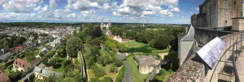Ces cages, je les ai vues, elles n’étaient pas larges, en effet, mais comme le dit la notice de Wikipedia, elles ne sont pas d’origine, tout juste des attrape-touristes sans doute… et dans le logis royal, les pièces m’ont semblé bien modestes, où ont vécu Charles le septième et sa belle compagne Agnès. Le corps de cette dernière gît juste à côté dans la collégiale Saint-Ours, surmontée de deux étranges cônes qui lui font comme un bonnet d’âne (on appelle ça des « dubes »). Du haut de la terrasse, juste au-dessus d’une barbacane (on appelle ainsi les avancées fortifiées destinées à supporter un siège) on découvre au loin les coteaux de Touraine, les charmants bocages et la basilique de Beaulieu. Agnès Sorel aimait son Roi à ce que dit l’histoire, et savait visiblement le mettre en émoi :