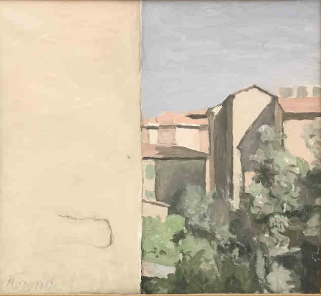 Je visitai il n’y a pas très longtemps (fin juin) l’exposition consacrée à Giorgio Morandi et aux futuristes italiens qui avait lieu au musée de peinture de Grenoble (jusqu’au 4 juillet), et qui jusque là n’avait pu être vue que de manière virtuelle. Il ne s’agissait pas d’une rétrospective mais seulement de la présentation d’une collection, celle de Magnani-Rocca. J’avais eu l’occasion, autrefois de m’arrêter en Italie, à Bologne, pour découvrir cette œuvre si originale, j’en avais même rapporté un poster qui fut pendant longtemps exposé dans notre cuisine. On est immanquablement surpris quand on découvre cette œuvre, qui n’est faite presque que de natures dites « mortes » (sauf quelques paysages, mais qui sont très particuliers) et quand nous disons « natures mortes », il faut préciser que ce ne sont pas des toiles à la Chardin ou selon quelque peintre flamand amoureux des cristaux, des croûtes de pain, des tissus ou des peaux duveteuses de fruits murs, mais rien que de très austère en apparence : des bouteilles, des flacons et des tasses de faïence, alignés selon un ordre rigoureux mais dont on ne perçoit pas la règle. Les couleurs le plus souvent sont neutres, ce sont des bruns, des beiges, des blancs laiteux, mais tout à coup au détour d’une de ces toiles, un rouge vermillon qui saute aux yeux, ou bien un bleu profond comme le lapis lazzuli. Les fonds sont uniformes, beiges et mats eux aussi et souvent, on distingue à peine une ombre par les objets portée, mais c’est bien faible, un peu comme si ces formes hiératiques n’avaient pas besoin qu’on insiste sur leur présence. Les paysages… campagne bolognaise… il ne faut pas s’attendre à des éclats, les verts sont saturés de blanc, les arbres sont d’ailleurs plus souvent gris que verts, et les ciels sont pâles. Un paysage incroyable dans cette exposition de Grenoble : lorsque je le vis de loin, je crus que c’était un diptyque. Au cours de l’année, notre professeur des Beaux Arts de Grenoble, Thierry Cascales, nous avait montré les tableaux d’un certain Josquin Pouillon, en nous demandant de nous en inspirer. Ces tableaux étaient des diptyques : sur la même toile, on voyait deux vues semblables mais qui n’étaient pas en continuité, comme si on juxtaposait deux points de vue sur le même paysage. Ayant travaillé la question, je ne pouvais, voyant ce tableau de Morandi, que penser qu’il s’agissait de la même chose, sauf que la partie gauche était… complètement nue ! Juste un grand à plat de peinture beige, avec il est vrai, une petite égratignure vers le bas. La partie droite représentait quelques maisons autour d’un parc, du genre de ce qu’on peut voir de plus anodin dans nos villes, qu’elles soient de France ou d’Italie. Me rapprochant, je m’aperçus qu’il n’en était rien, ce n’était pas un diptyque, mais simplement une vue depuis l’intérieur d’une chambre, et la partie gauche était un mur, le mur probablement qui bordait la fenêtre à partir de laquelle le peintre voyait le paysage, ou, plus exactement « la cour de la rue Fondazza ».