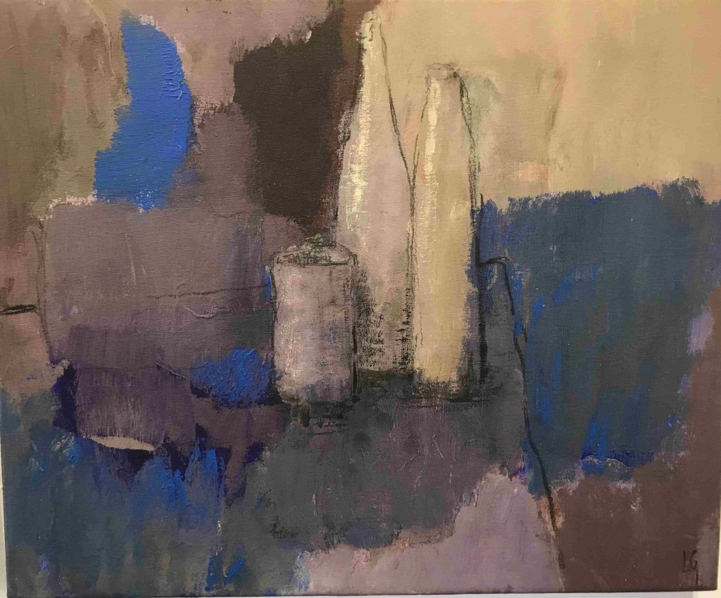 Voyant ses œuvres et notamment ses « vies silencieuses » (traduction de still life par quoi la langue anglaise exprime ce que nous appelons tristement en français « natures mortes »), je n’eus pas le réflexe d’en acheter une (je n’ai pas la tendance spontanée à l’acquisition d’une œuvre d’art), ce que je me suis reproché par la suite, mais à quoi j’ai remédié en prenant contact avec la galerie et en me faisant envoyer par la poste une de ces œuvres. C’est le cadeau de Noël que je me suis fait en quelque sorte. Quelle émotion que d’avoir entre les mains la toile d’un(e) artiste, d’effleurer du doigt les zones où elle a promené son pinceau, touchant délicatement la surface et choisissant des nuances de brun ou de bleu, mettant un dessin à peine suggéré au moyen d’un trait de fusain. Plus j’observe ce tableau (le dernier de la série ci-dessus), plus je l’admire, plus je me dis que je n’arriverais pas à reproduire cet effet qu’il donne: les couleurs y sont sourdes et mates (d’une façon que je ne sais pas produire moi-même), on a envie de le toucher parce que la peinture étalée ressemble à une peau duveteuse. En reproduction ou en photo, cet effet n’est pas perceptible, il n’y a qu’en regardant l’original de près, en le caressant des doigts qu’on s’en rend compte. Vive Lucie Geffré! dont on peut trouver sur la Toile des videos et des interviews passionnantes. Voir aussi ici (poème pour Lucie Geffré).