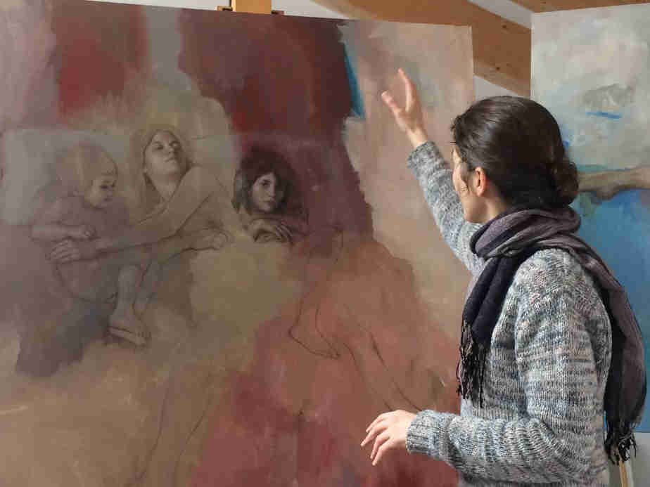 Mais plus loin encore, nous entrions dans l’antre de Lucie Geffré. Une pièce remplie d’œuvres aux teintes souvent tertiaires, à moins qu’un bleu cyan ou un blanc de titane ne s’immisce, voire même un magenta un peu foncé pour donner une ambiance chaude et intime. L’intimité est le maître-mot de la peinture de Lucie Geffré, intimité des corps et des visages cadrés au plus près, corps parfois alités, saisis au matin d’une journée ou au soir d’un hiver au cours duquel on en oublie jusqu’à l’écoulement du temps ; et puis intimité des objets comme s’ils avaient une vie à eux, pétrie de silence (des vases, des bouteilles, des pots, là où l’on sent une certaine influence de Morandi).