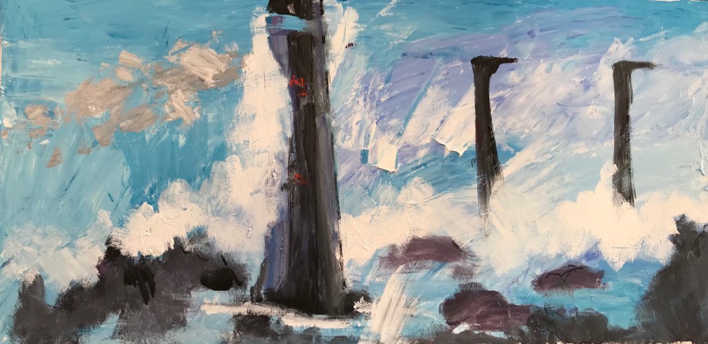 La première de ces toiles: qui est allé à Ouessant y reconnaîtra la pointe de Pern et le phare de Nividic, avec ses deux auxiliaires, deux poteaux plantés en pleine mer pour apporter l’électricité. Le « réalisme » aurait voulu que je les mette en perspective. En les mettant sur le même plan, je veux souligner le caractère hiératique de ce paysage. Le phare et ses acolytes sont dressés pour l’éternité, même si aujourd’hui ils ne servent plus à grand chose, les câbles électriques ayant été retirés.