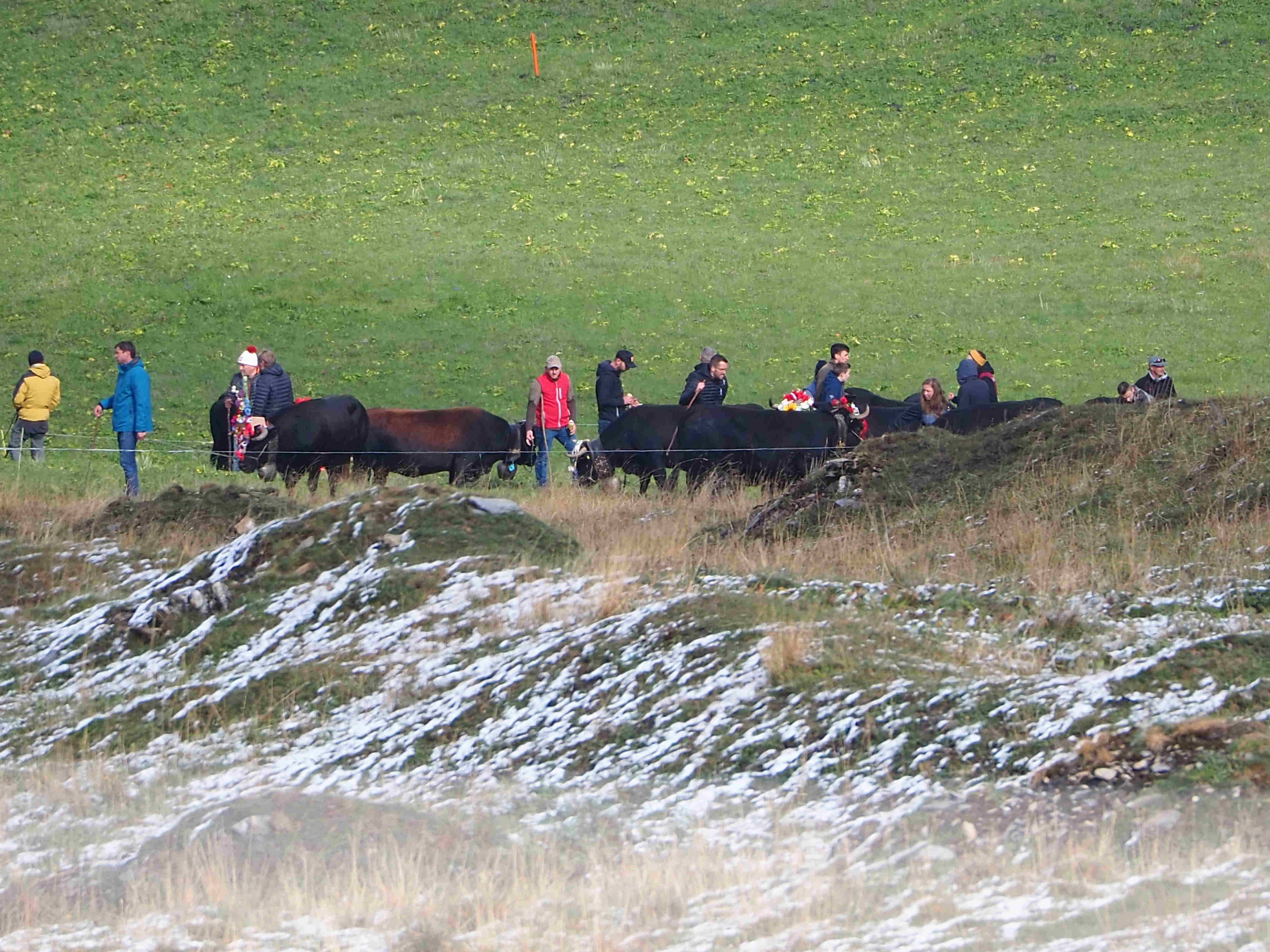 Trois semaines au Valais en septembre, qui se terminent sous la neige. Des chemins de racines et de pierres jusqu’à 2700 mètres, des champs pentus où fleurit la gentiane bleue. Vaches, génisses, modzons se retiennent comme ils ou elles peuvent afin de ne pas dégringoler du haut des falaises. Au fond des vallées qui pénètrent très loin le massif orné d’arêtes de dentelle, les troupeaux s’ébattent, les alpages façonnent les fromages qui portent leur nom comme appellation. Peule. Léchère. Ars-Dessus. Ars-Dessous. Bagnes. Mont Percé.