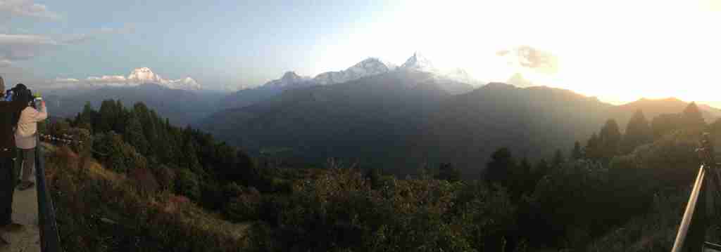 Le lendemain s’avère plus dur: comme à Muldai Peak, lever très tôt, vers 4h30, pour partir à l’assaut de Poon Hill dès 4h50, afin de voir encore une fois le soleil se lever sur la chaîne des Annapurnas. Las, cette fois-ci c’est moins drôle, nous sommes toute une cohorte à monter vers le sommet, les plus jeunes me doublent évidemment de façon impitoyable, « attendez-moi » je crie faiblement… Tout ce monde arrive à peu près en même temps sur la plateforme, plusieurs centaines de personnes qui attendent que les premiers rayons du jour éclairent les sommets qui nous sont maintenant connus. La montagne paraît plus grise qu’à Muldaï. Quand enfin le soleil se lève, les caméras et les appareils électroniques se mettent en action, de fait, ce sont moins les montagnes qui sont photographiées que les gens devant les montagnes, ainsi notre bel assemblage d’acteurs ou de danseurs se mue en un simple décor, et c’est comme si les montagnes se taisaient. A Muldaï, nous dialoguions avec elles, ici elle se sont murées dans leur indifférence. Déception.