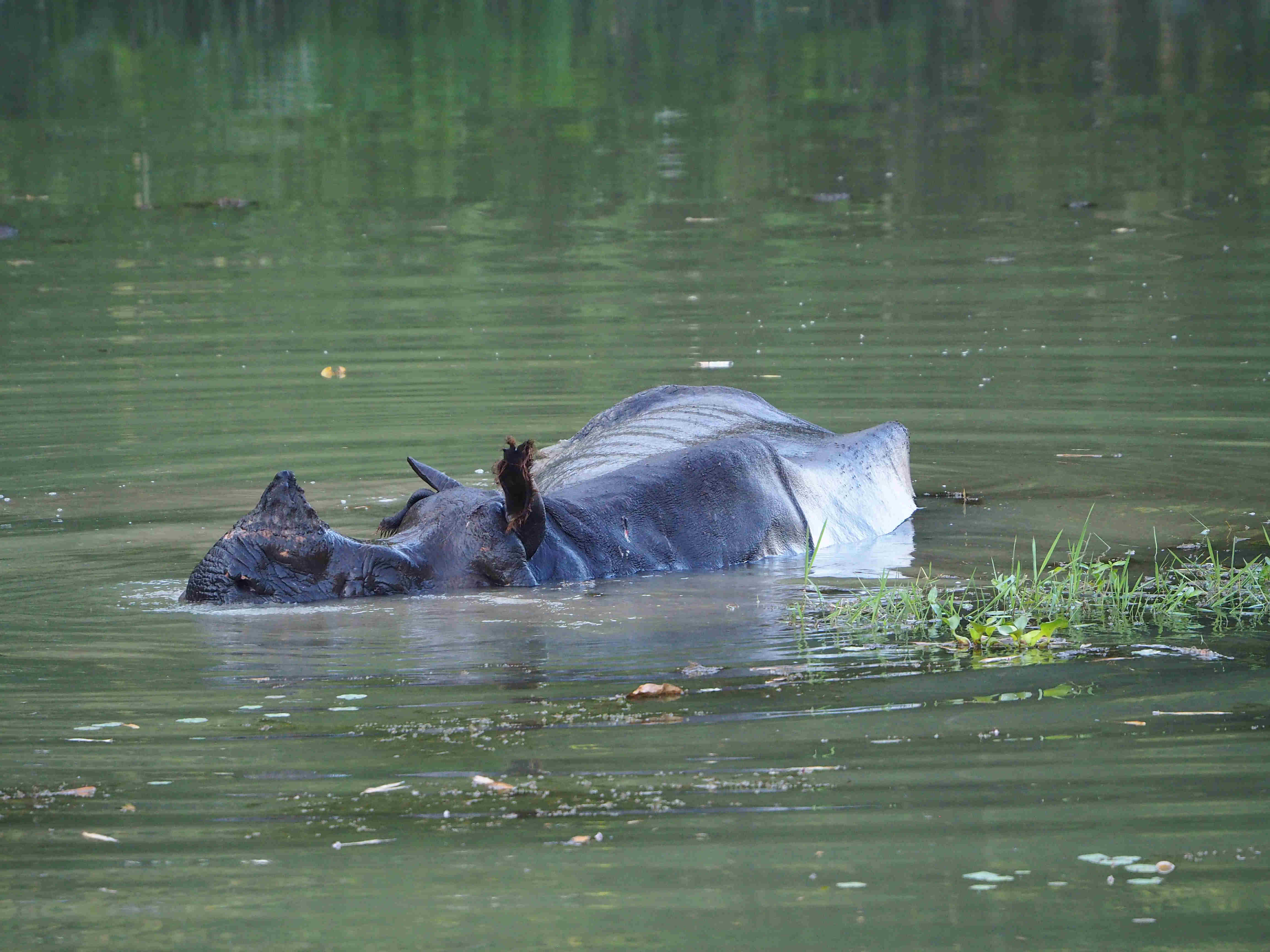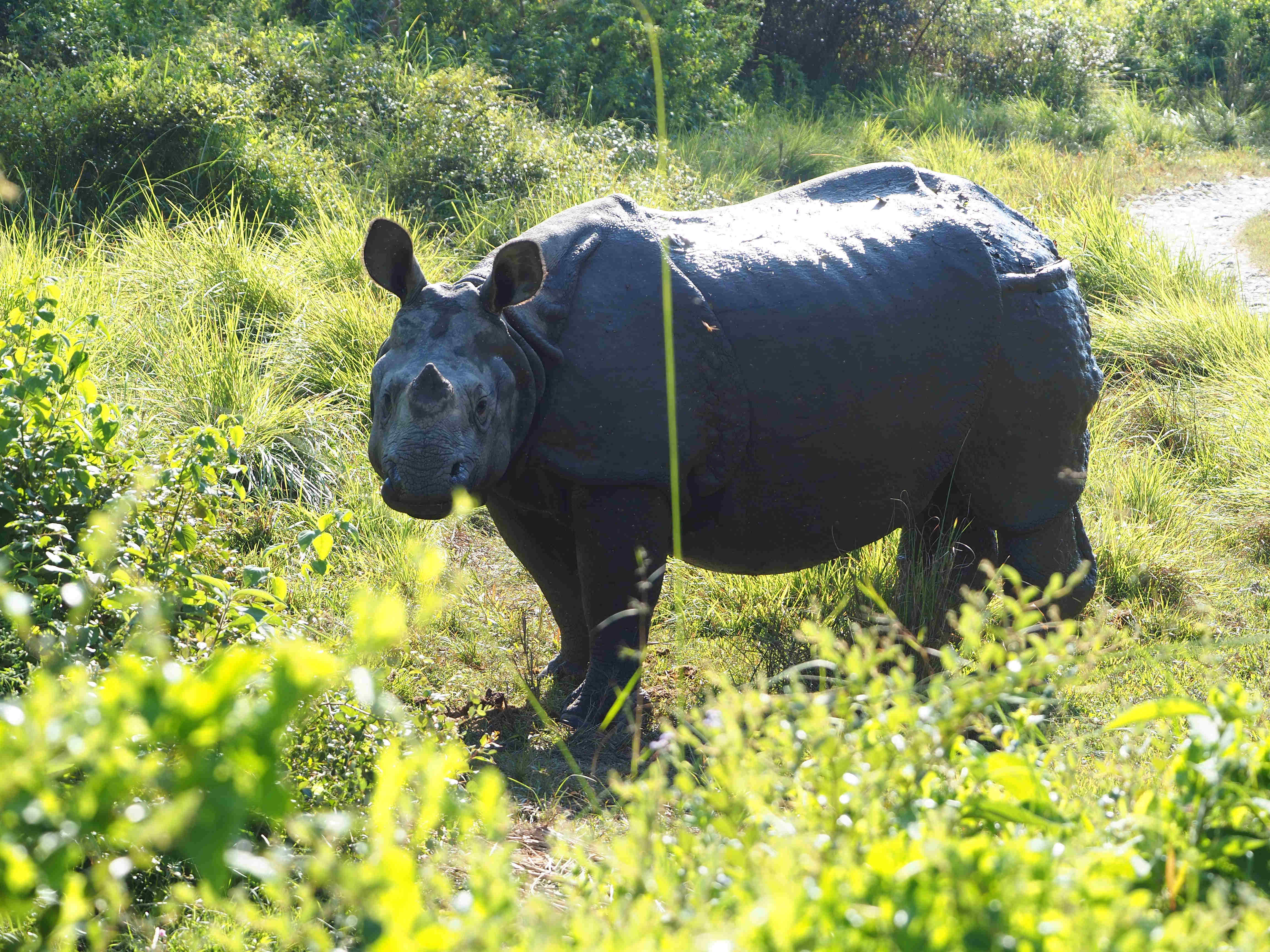 Le lendemain, balade dans la forêt. Stupéfaction lorsqu’un rhinocéros tombe sur nous à un détour de chemin, il n’apparaît pas menaçant, mais plutôt lent dans ses déplacements, sa cuirasse luit en plein soleil, il sort de l’eau toute proche. Au loin des crocodiles sont profondément indifférents, et des oiseaux s’en amusent, qu’il s’agisse de martin-pêcheurs, de cormorans noirs ou d’oiseaux serpents (dont le cou est si long qu’il fait penser à un serpent). Le soir, spectacle culturel dans le village de Sauraha, auquel nous nous rendons dans ce genre de véhicule qui nous a servi à parcourir la jungle, un plateau ouvert qui ressemble à une charrette mais tirée par un puissant moteur au lieu de chevaux ou de buffles. Effervescence de fin de vacances, de fête de Dipawali, des bougies sont allumées partout et tous les seuils sont décorés de mandalas. Au centre culturel, j’aime rejoindre la foule des danseurs villageois, seule fois où j’aurai l’opportunité au cours de ce voyage de partager quelque chose avec les gens ordinaires, qui ne sont ni guides ni patrons de lodges, enfants qui ne savent pas comment se retourner dans cette atmosphère de fête, femmes qui perdent leurs chaussures dans les rires et les acclamations.