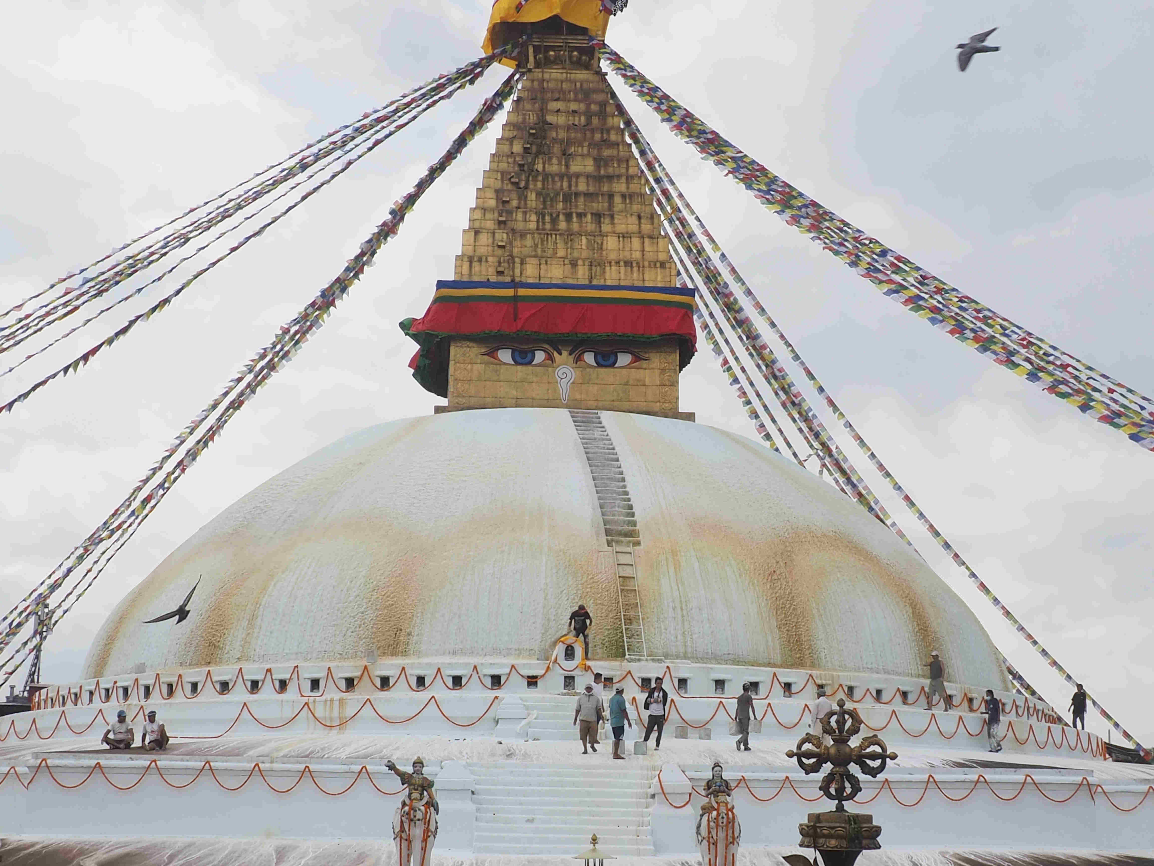 Après Chitwan retour à Katmandou (en avion), belle journée avec Anne pour lui montrer ce qu’elle n’a pas encore vu de cette belle ville. Émotion de se trouver sur la grande place du stupa de Bodnath, place aussi vivante que la place Saint-Pierre à Rome un jour de bénédiction, ou que la place Saint-Marc à Venise, quand les pigeons noircissent le ciel. Non loin de là, quelques pas en dehors de la place conduisent au monastère de Schechen, célèbre pour nous car nous savons qu’il héberge Matthieu Ricard. Espace de paix et d’harmonie, les échos bruyants de la ville ne vont pas jusqu’ici, une terrasse au soleil permet de prendre un thé ou une collation, on dit que les chambres destinées aux invités sont spacieuses et agréables, voilà un coup à tenter pour une fois future où nous serons à Katmandou…