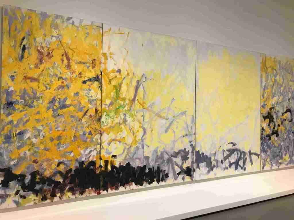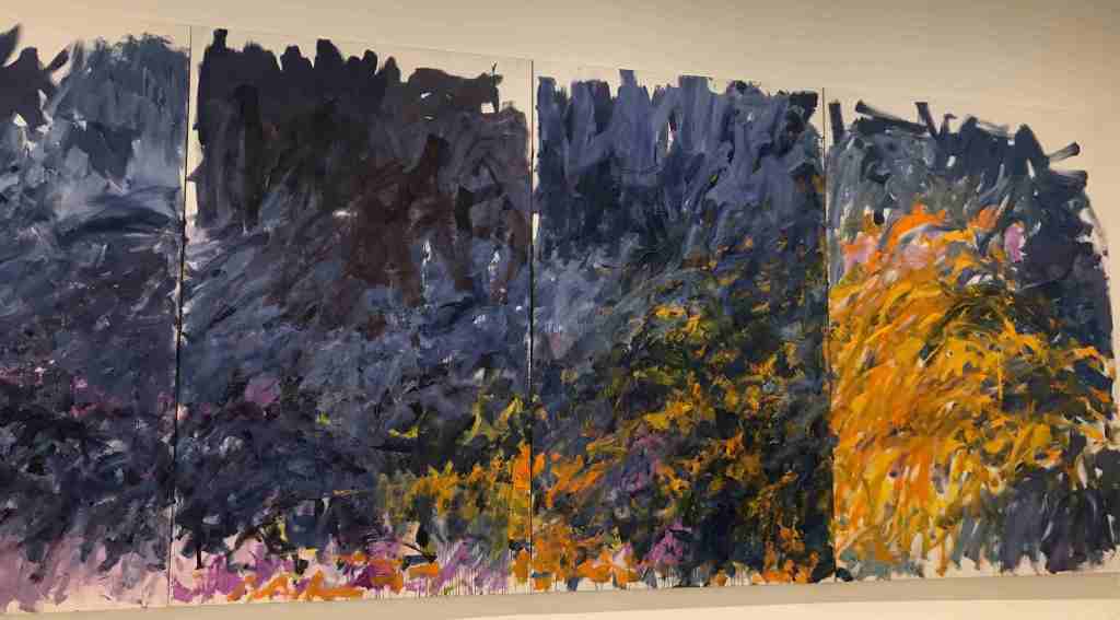 Long préambule pour quatre jours passés à Paris. Le premier, à vrai dire, nous propulsait loin du XIXème pour une fois, du moins en apparence, car le Jardin d’Acclimatation, auprès de quoi s’est construite la Fondation Louis Vuitton, en est lui, tout imprégné. De même que Claude Monet. Force d’un siècle qui apparaît comme ayant tout prévu des continuations de l’art, puisque le grand peintre des Nymphéas annonce la virtuosité abstraite de Joan Mitchell, peintre représentative du XXème s’il en est. Et qui pourtant elle-même revendique son enracinement dans le siècle d’avant : Monet bien sûr, mais aussi Cézanne et van Gogh. Bel hommage qu’elle rend au peintre à l’oreille coupée en transposant dans l’univers abstrait la toile des blés survolés de corbeaux qu’Artaud indiquait comme étant la dernière de van Gogh. Dans l’histoire de l’art, les flux s’entremêlent, il y a continuité, beau hasard qui fait que Joan soit née un an avant la mort de Monet, comme s’il fallait poursuivre une œuvre inachevée, les bouddhistes verraient là peut-être un exemple de réincarnation. En tout cas, lorsqu’on voit au loin le triptyque de l’agapanthe se profiler entre deux Mitchell qui l’encadrent comme deux volets, on croit vraiment en une continuité. Différence toutefois, là où le peintre français se limite à l’exploration de la vision, à comprendre comment l’eau des étangs, les herbes aquatiques et les fleurs des nymphéas peuvent venir impressionner notre rétine, l’artiste américaine se détache progressivement de cette obsession pour se rapprocher de la musique. Dans certaines grandes toiles, les touches de couleurs s’égrènent comme des collections de notes rapprochées, souvent dans des teintes froides (sonorités cristallines) puis tout à coup chaudes et lumineuses. Alors que Monet scrute son jardin, Mitchell déclare dans l’une de ses interviews fermer les fenêtres pour peindre car ce qu’elle veut montrer c’est le sentiment que lui inspire le paysage et non le paysage lui-même puisque aucun peintre jamais ne le fera aussi beau qu’il n’est dans la réalité. On ressort de là ébloui, même si le « grand vaisseau » planté par Frank Gehry nous laisse un peu sceptiques quant à son architecture, on y verrait plutôt un dinosaure géant sorti de derrière les grand arbres du Bois de Boulogne.