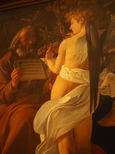 Ces tableaux ne sont pas seulement des images pour exciter nos sens, ils sont aussi des interprétations, des récits bibliques, voire même des conceptions philosophiques ou des prises de partie dans des débats. Le merveilleux tableau au centre de la chapelle Contarelli montre Saint Matthieu conduit par un ange pour écrire son Evangile. Le commentaire nous dit que, primitivement, la main de l’ange touchait le saint, mais que suite à des débats théologiques, on convint, et Merisi (le vrai nom du Caravage) convint aussi, qu’il ne fallait pas montrer un tel contact qui aurait pu faire penser que l’ange avait dicté le texte à Matthieu, alors qu’en réalité il n’avait fait que le lui inspirer. Ainsi, la figure de l’ange se replie-t-elle en un monde autonome, on serait tenté de dire une monade, disjointe de celle de l’écrivant, deux mondes parallèles qui n’échangent entre eux que par l’écriture, n’est-ce pas déjà percer le mystère de la littérature ?